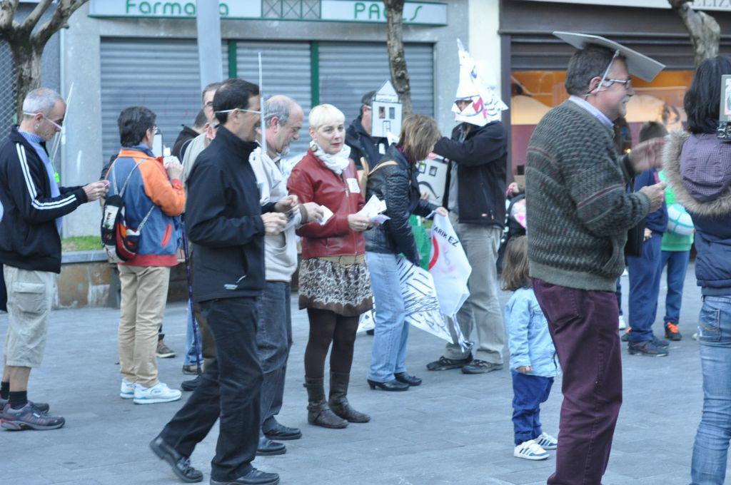 Oarso Taldeak deituta, giza katea abiatu berri da Foru Plazatik. Jai giroan, musikaz lagunduta eta marrazoz mozorrotuta erdialdeko kaleak zeharkatuko dituzte. Hogei bat lagunek egin dute bat protesta ekimenarekin. Murrizketen kontrako banderolak eta etxe kaleratzeen kontrako kamixetak zituzten hainbat lagunek.