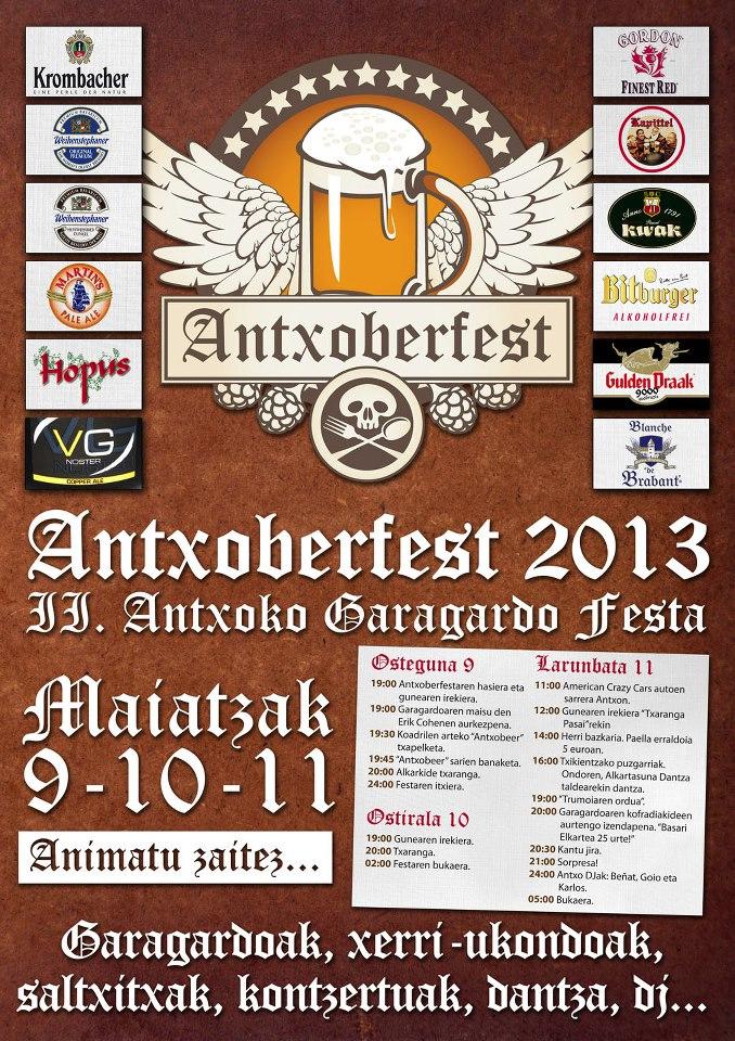 Antxoberfest II. Garagardo Festa, ostegunetik larunbatera, barrutiko Jai Batzordearen babesarekin. Festaren oinarria, Marcos Novo antolatzailearen arabera, “garagardo mundialak eta jaki goxo-goxoak” badira ere, antxotarren auzolana nabarmendu ditu: “Antxotarren lanari esker aurrera atera zen iaz festa, eta aurten ere hala izango da. Auzolanean antolatutako jaia da, eta aurten, gainera, lanean aritzeko iaz baino eskaera gehiago jaso ditugu”. Iaz 1.800 litro garagardo saldu zituzten festaren barruan. Aurten marka hori haustea espero dute antolatzaileek, eta onura barrutiko festek jasoko dute.