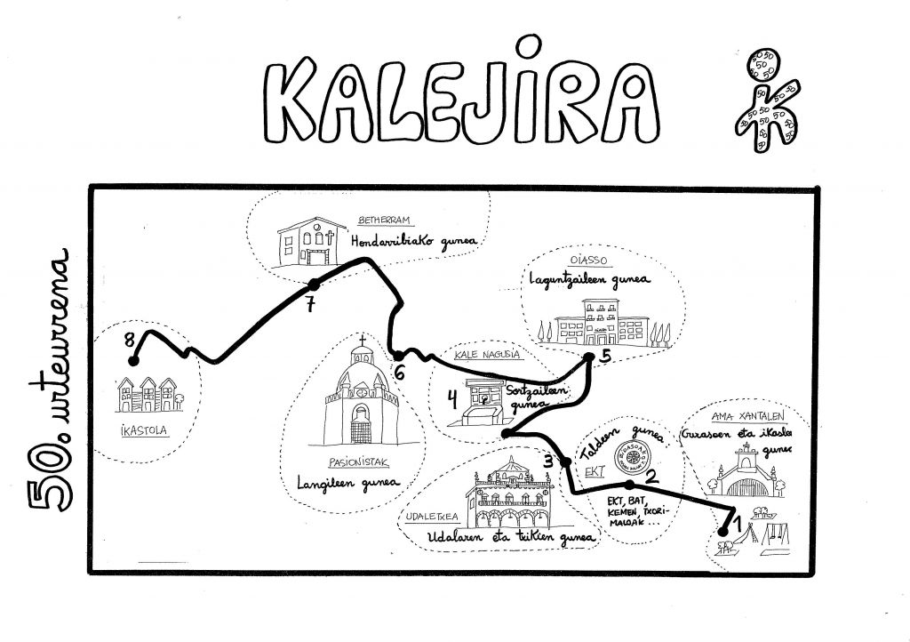 Kalejirari dagokionez, Ama Xantalenetik hasita ikastolaraino, bi ordu eta erdiko eta zortzi gunetan banatutako kalejira-ibilaldia egingo dute, 10:00etatik 12:30era. Gune bakoitzean ikastolarekin harremana duen edo izan duen eragileren bat omenduko dute. Honakoa da ibilbidea: