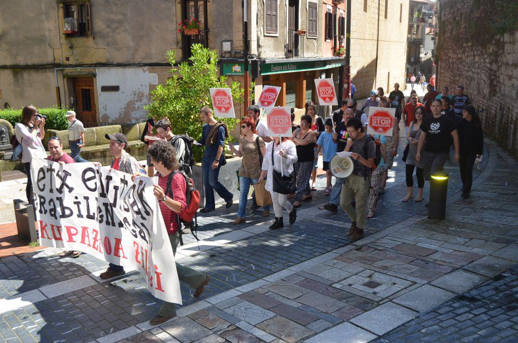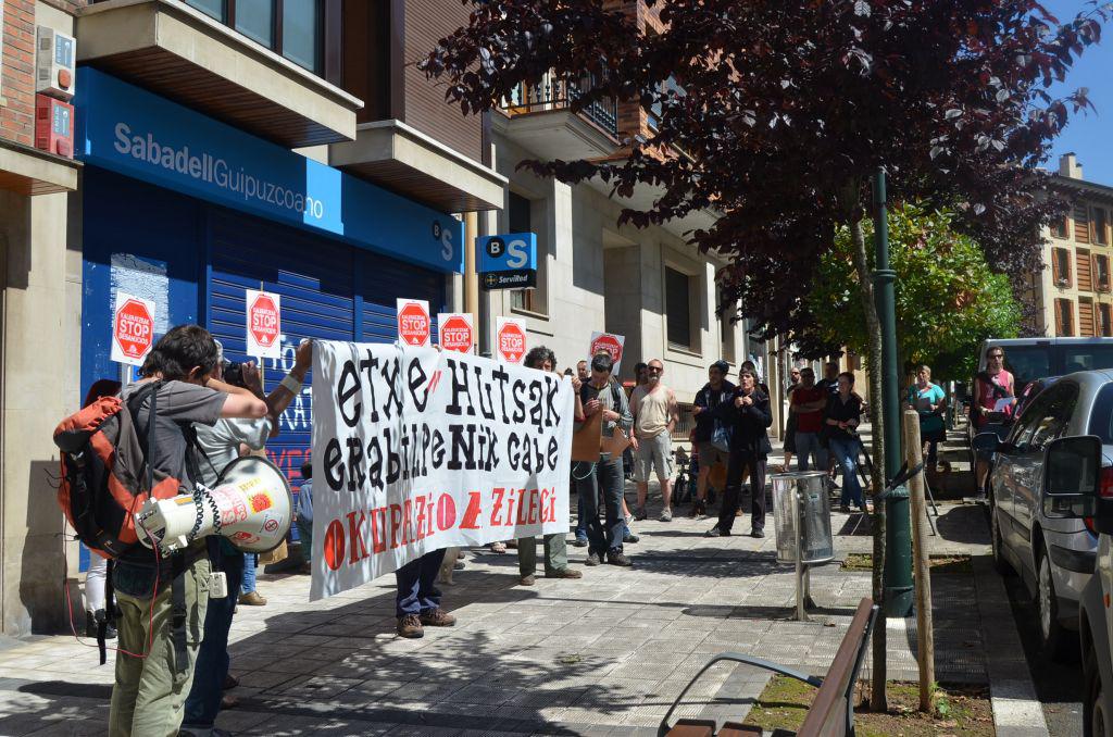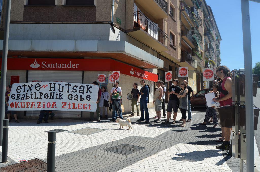 Etxe hutsak erabilpenik gabe, okupazioa zilegi zioen pankartaren atzetik.Herriko kaleetatik barrena ibili dira eta