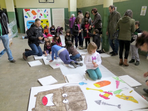 Euria egin zuen arren, ume eta guraso asko joan ziren parkeko frontoira adierazi dute antolatzaileek, Galtzarabordako auzo elkarteko kideek. Euria izan zen, hain zuzen, murala kalean itsastea oztopatu zietena.