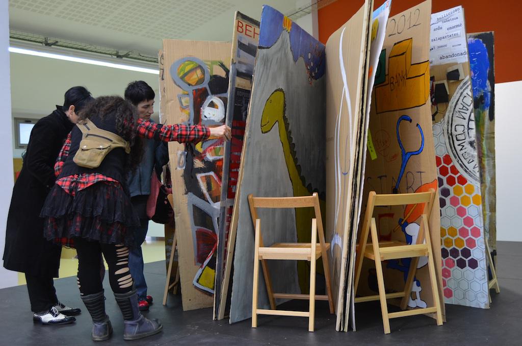 Erakusketa zenbait gunetan banatu dute. Sartu bezain laster, artista liburuen erakusketa ikus daiteke, eta segidan, arte koadernaketako lanak. Ondore, Arteliburu 21ekoek egindako lanak daude, eta atzean, artista liburu erraldoi bat, Olatu Talkan egindakoa, eta Krisiaren liburua deitutakoa. Alboan, tamaina txikiagoko liburu bat dago, eta hori betetzea espero dute antolatzaileek. Tailerrak egiteko guneak albo batean daude.