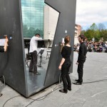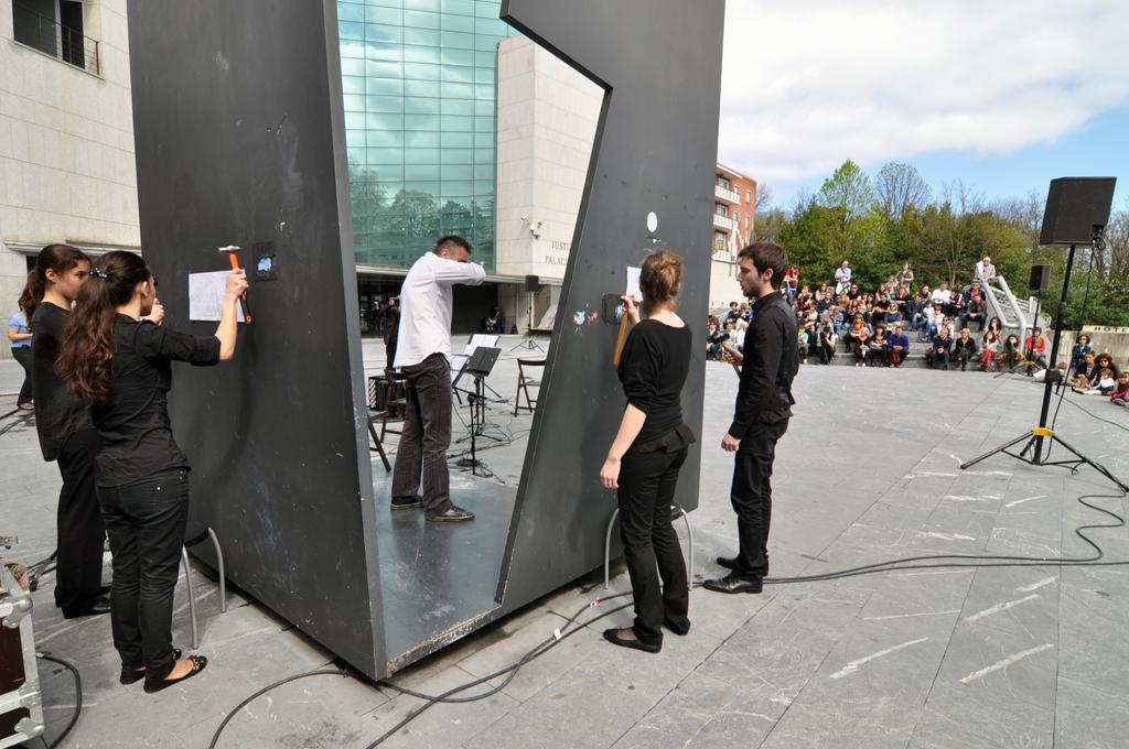 Ertz hutsetik musika eta dantza ikuskizuna estreinatu du gaur eguerdian Irunen, epaitegien aurrean, Jorge Oteizaren