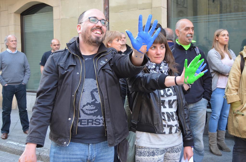 Estatuen esku hartzea gelditu lelopean hainbat herritar bildu ziren Herriko Plazan, eta koloreztatutako eskuarekin gelditzeko keinua irudikatu zuten.