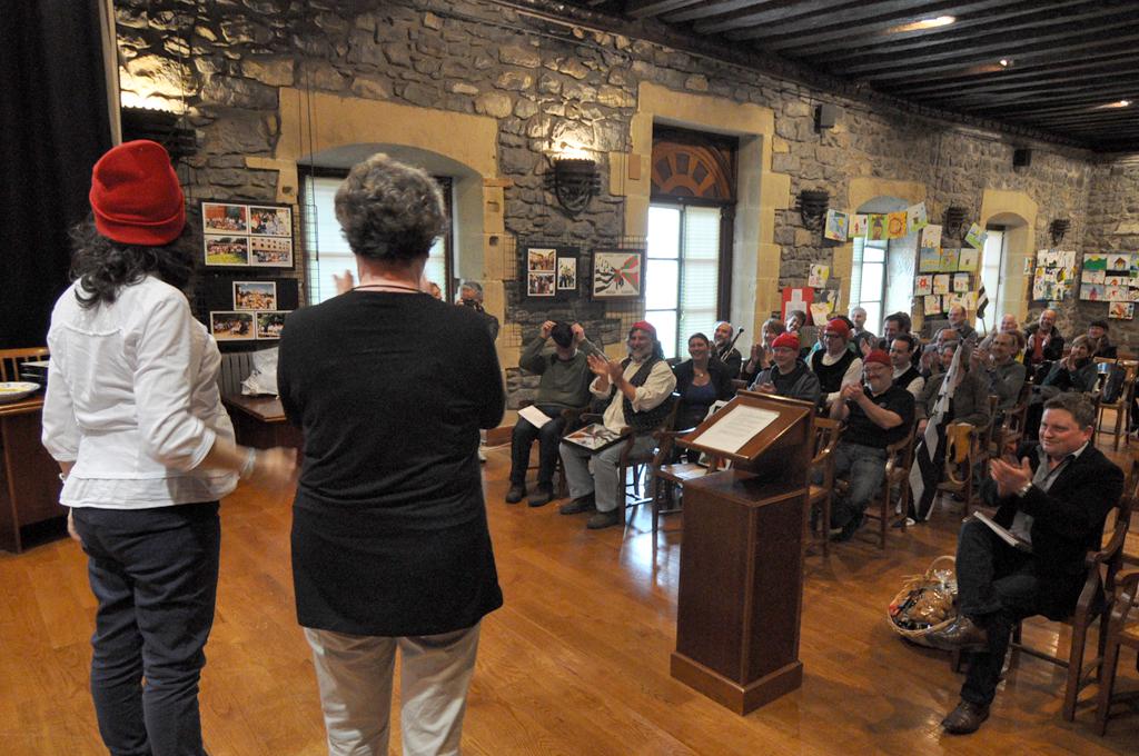bonnet rouge-a jantzi du Perez de San Romanek. Egun Bretainian darabilten borrokaren barruan desberdinen arteko batasunaren ikur bilakatu da gorri koloreko txanoa eta txaloka hartu dute areto nagusian zeuden karaeztarrek alkatearen keinua, eta beraiek ere jantzi dute euren