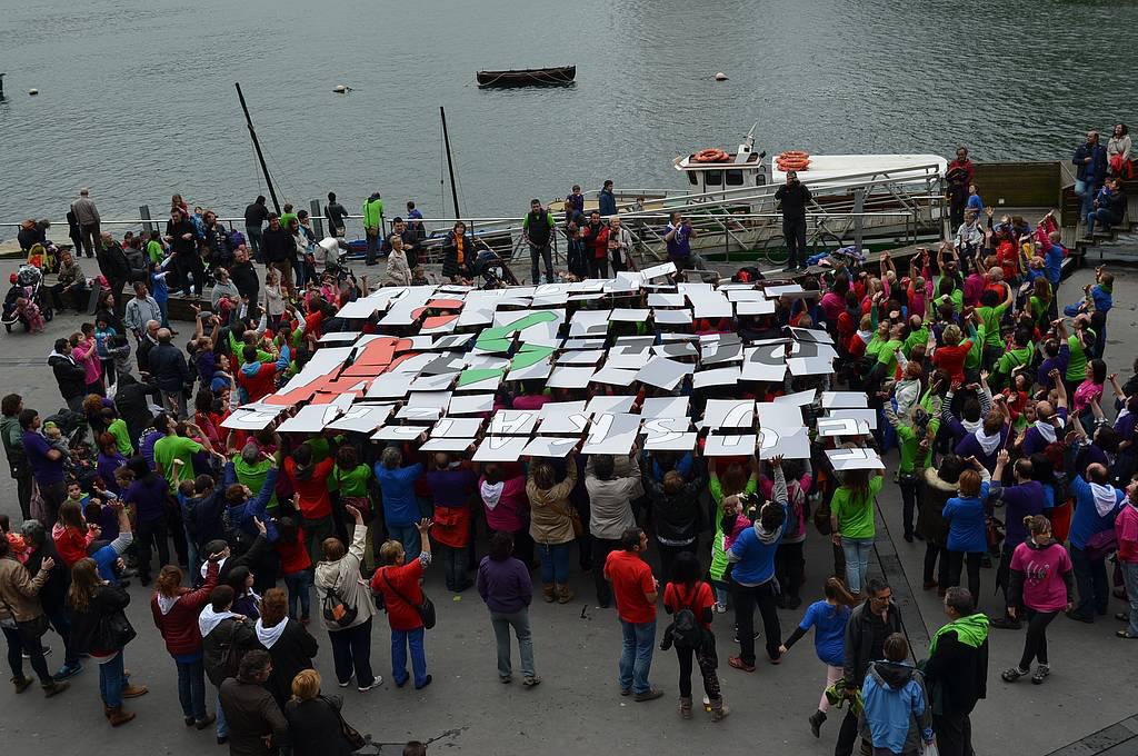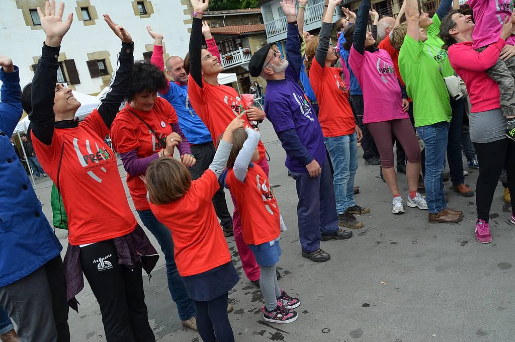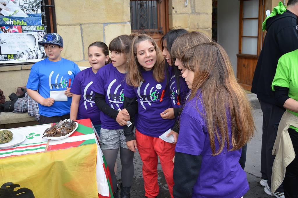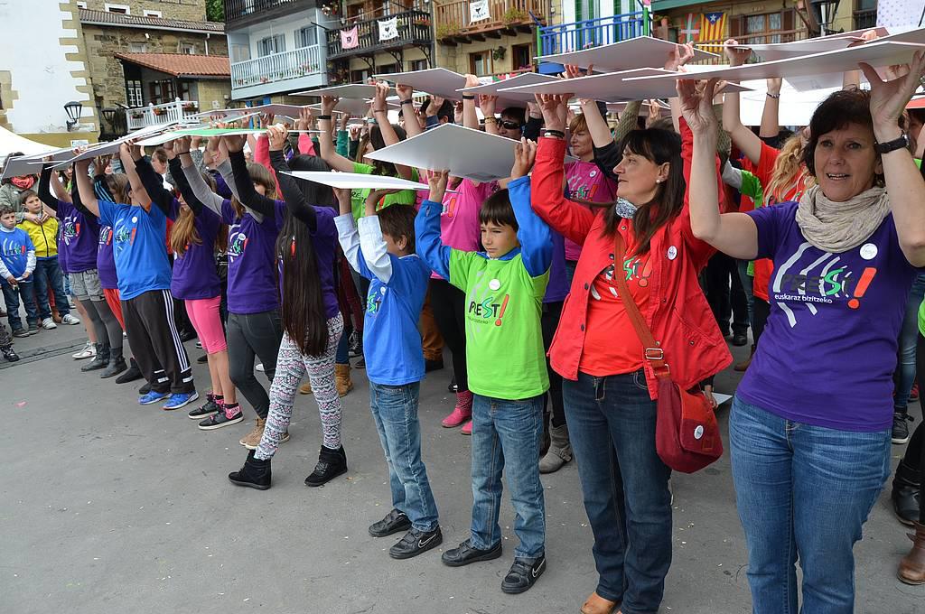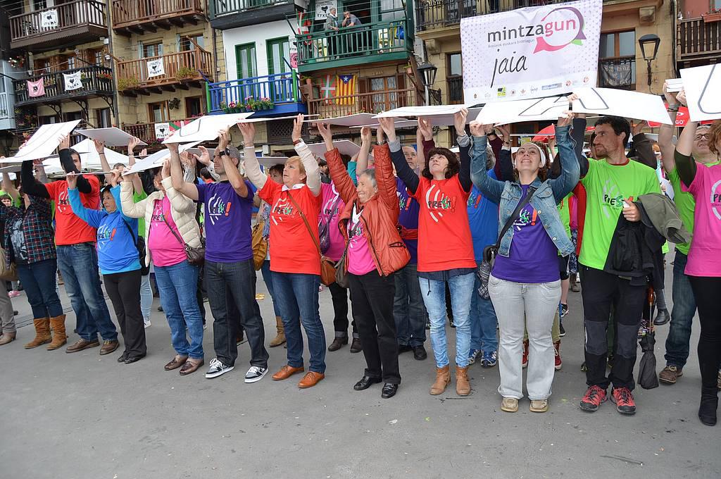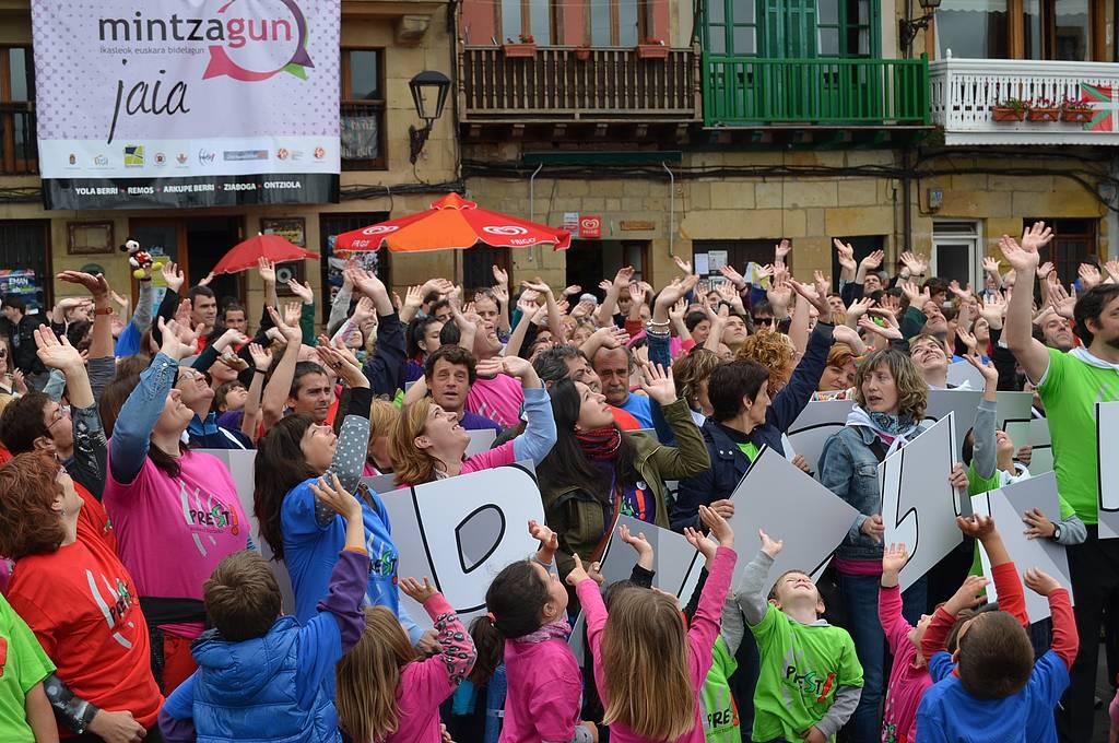 Euskaraz bizi nahi dutela aldarrikatzeko plazara irten ziren atzo hamarnaka pasaitar, eta koloretako kamisetak soinean, Donibaneko plazan bildu ziren, Prest! leloa osatu eta argazkia egiteko. Euriak lasaialdia eman zuen mosaiko erraldoia egin bitartean. Bestalde, Mintzagun jaia ere egin zuten Oarsoaldeko euskaltegietako ikasleek egunean zehar.