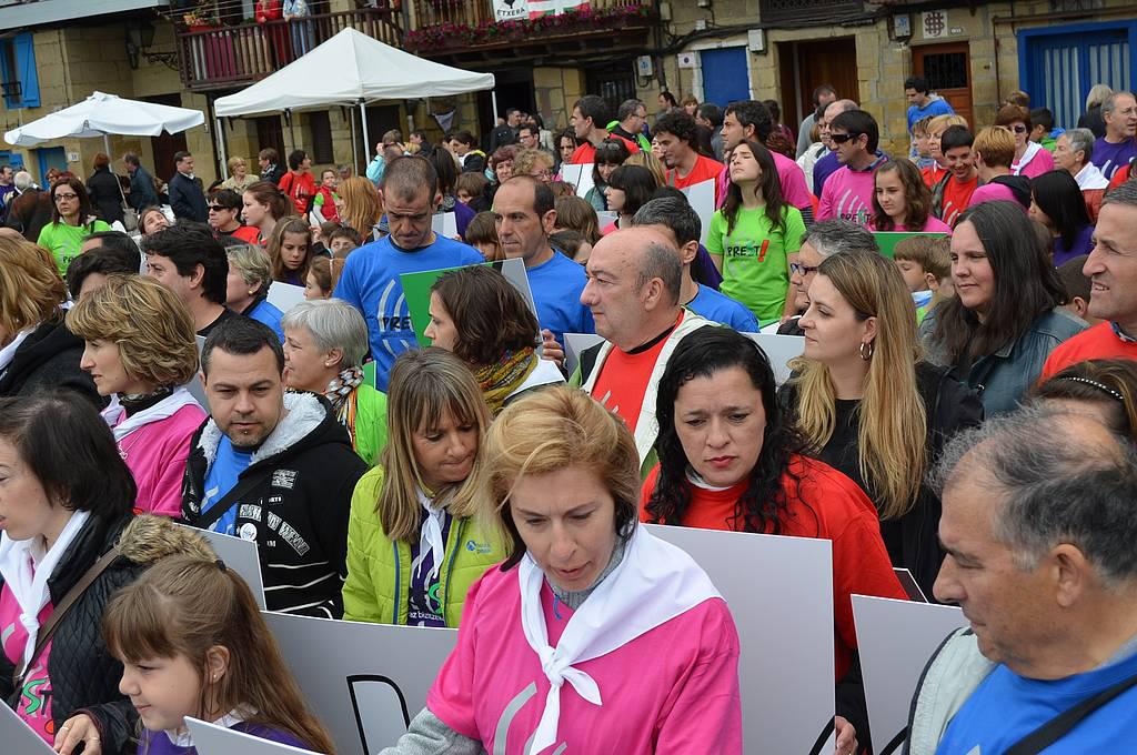 Euskaraz bizi nahi dutela aldarrikatzeko plazara irten ziren atzo hamarnaka pasaitar, eta koloretako kamisetak soinean, Donibaneko plazan bildu ziren, Prest! leloa osatu eta argazkia egiteko. Hezkuntza, kultura, aisialdia, euskalgintza… sektore guztietako pasaitarrak bildu ziren plazan, eta bakoitzak letra bat osatu zuen mosaiko erraldoia osatzeko.
