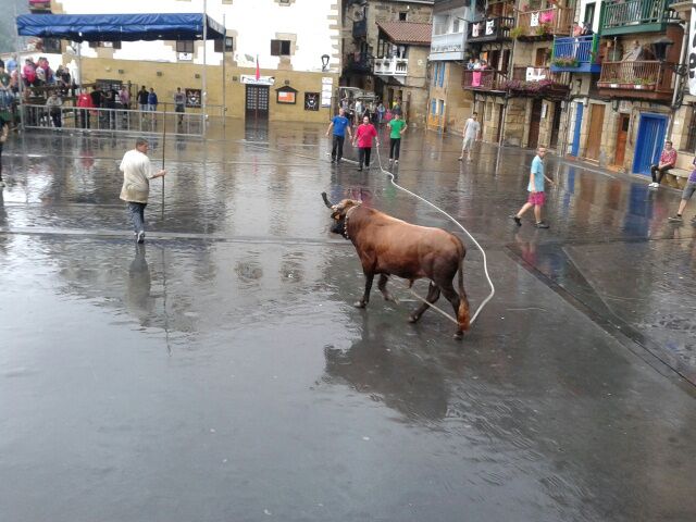 Berezia da oso Pasai Donibaneko Santio Jaietako sokamuturra. Hala azaldu zuen Mikel Laboa abeslariak, Xenpelar bertsolariaren bertso sorta musikatuz. Bada gaur goizean, abesti horretan esaten dena ez, baina antzeko zerbait gertatu da. Goizeko sokamuturrako zezenetako bat —bigantxak izaten dira egun—, Pasaiako badiara erori da