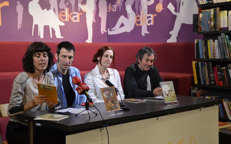 Jokin Mitxelena –ezkerretik bigarrena– liburu aurkezpenean, Donostiako Elkarren
