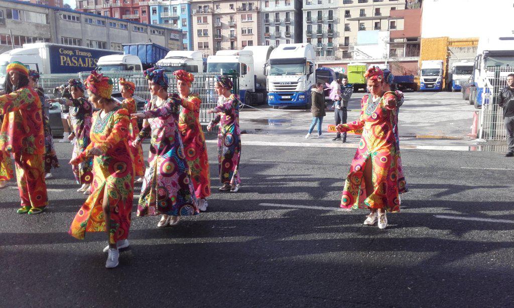 Desfilea euriarekin hasi da. Hamar minutu izan dira. Ondorengo urdinguneak utzi du segizioak behar zuen giroa bermatzen. Eta a zer giroa jarri duten hamarnaka konpartsetako ehunka dantzariek! Infiltraturen bat ere egon da bafle erraldoidun furgoneten artean.