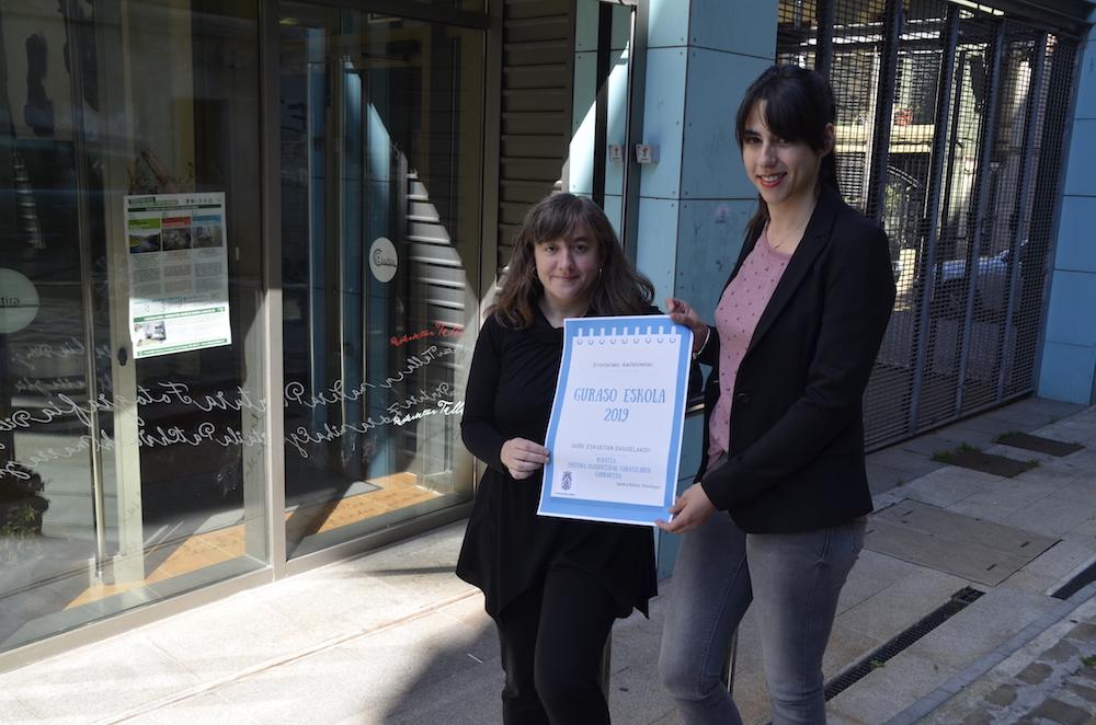 Lopez de Etxearreta eta Muñoz Guraso Eskolaren aurkezpenean. Guraso Eskola martxan jarri du Errenteriako Udalak. Helburua, 2-16 urte arteko haur eta gazteen gurasoen dinamizazio eta heziketa egitea, eta izan ditzaketen behar eta kezkei erantzutea da. Guraso Eskola herriko ikastetxeetako guraso guztiei zuzenduta dago, eta aurten, lau saio eskainiko ditu. Sandra Muñoz psikologoak gidatuko ditu saioak eta ikastetxe bakoitzak bere egutegi eta ordutegiak izango ditu saioetarako (hemen kontsulta daitezke). Hilabete honetan izango da lehena, eta Ohitura osasuntsuak garatzearen garrantziaz arituko dira.