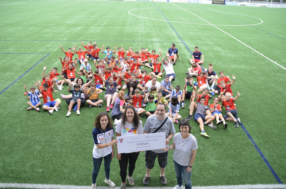 Touring elkarteak 585 euroko txekea eman dio Mindara elkarteari inklusibitatearen aldeko lanean jarrai dezan. Mindara elkarteko haurrak Jon bautista Campuseko haurrekin batera izan dira gaur Fanderiako futbol zelaian.