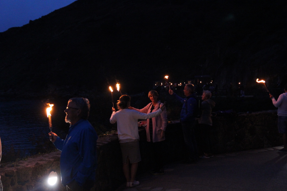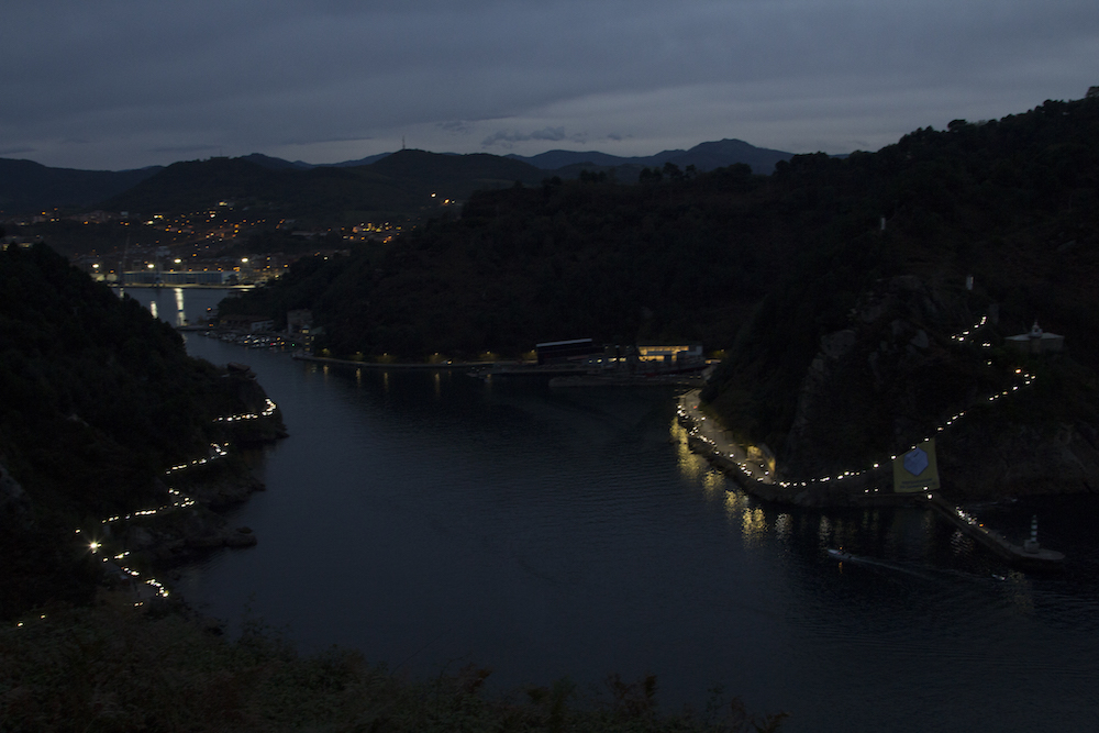 Donibanen Alabortza inguruan hasten zen argien katea eta kasik Bonantzaraino egiten zuen ibilbidea. San Pedron ordea, puntetan hasi, eta Platako Farolara igotzen den eskailera argiztatu zuten. Goiko partetik pankarta erraldoia atera zuten Erreferenduma demokrazia da esaldiarekin. Era berean azpiko itsas-morruan demokrazia hitza osatu zuten zenbait lagunek kartelak eskutan zituztela.