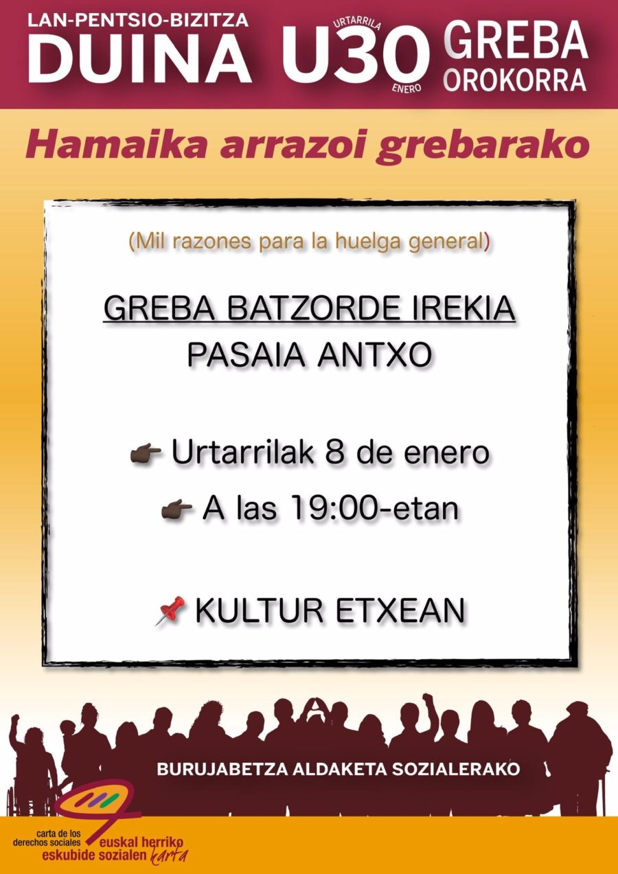 Hilaren 30rako deituta dagoen greba orokorrerako antolakuntza lanak hasiko dituzte Antxoko Kultur Etxean.