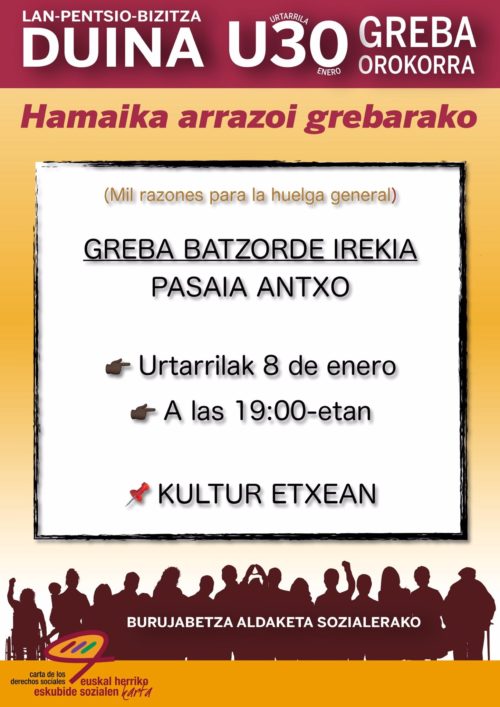 Euskal Herriko Eskubide Sozialen Kartak deituta, lan, pentsio eta finean, bizitza duinen defentsa eta aldarria egingo da hilaren 30erako (osteguna) deituta dagoen greba orokorrean. Grebarako hiru aste falta direla, Greba Batzorde Irekia egingo dute gaur Pasai Antxoko Kultur Etxean, 19:00etan.