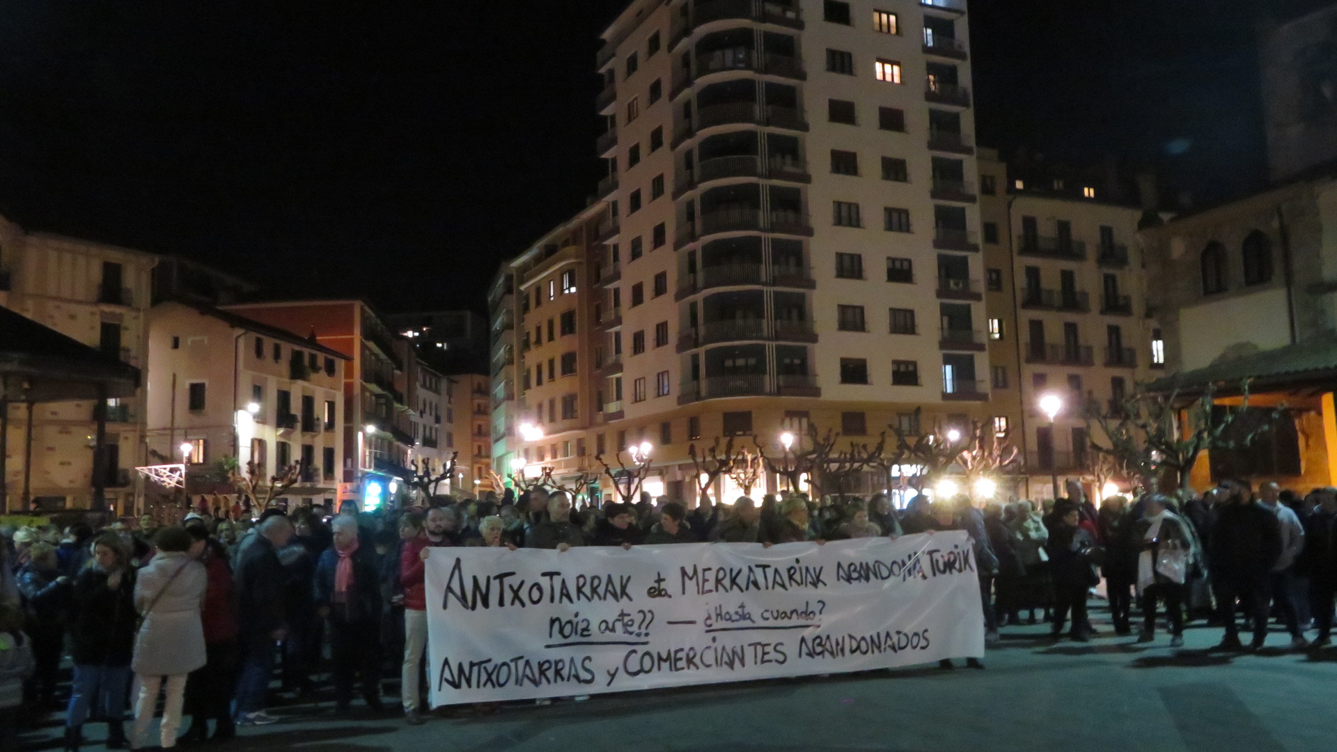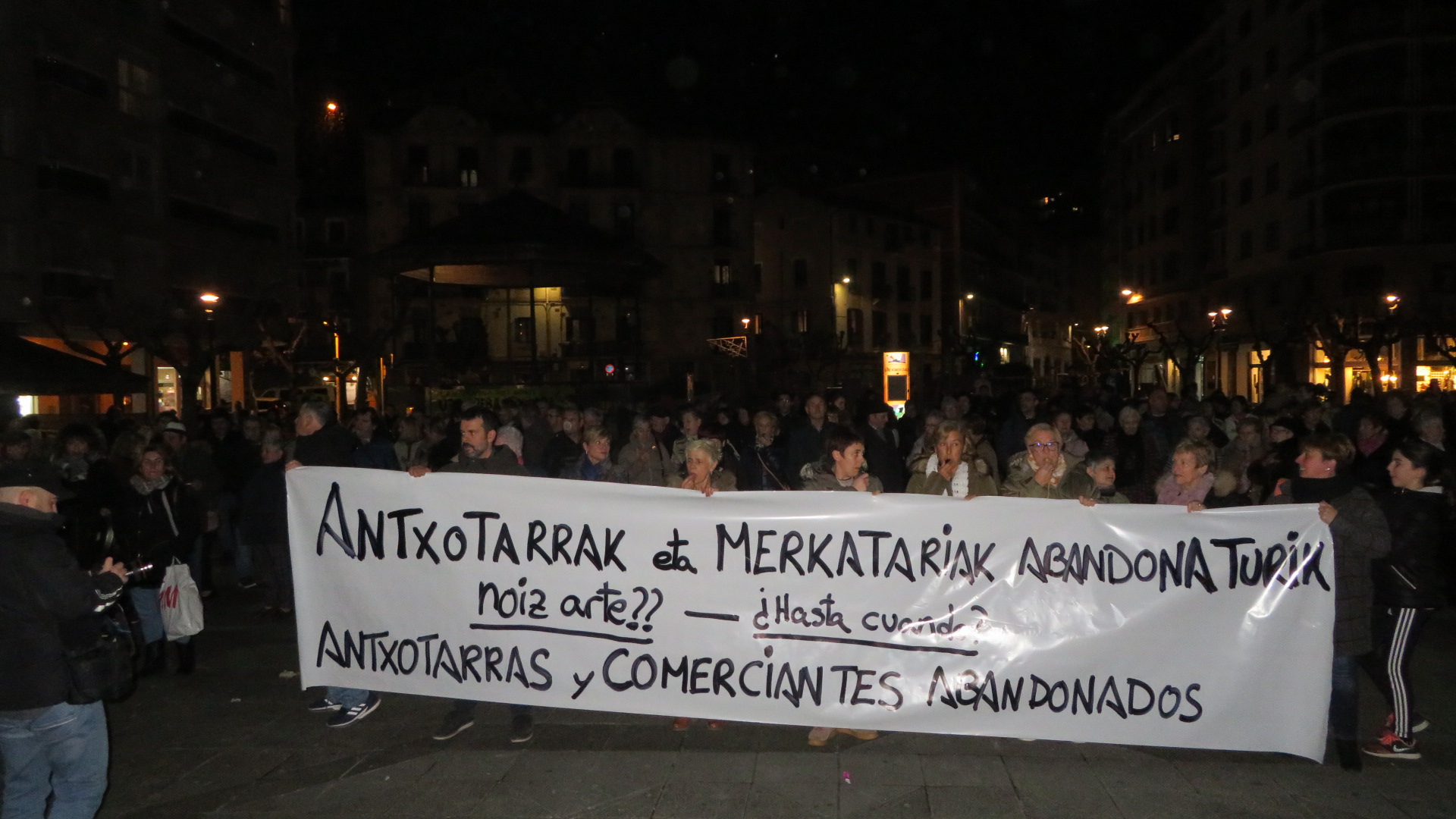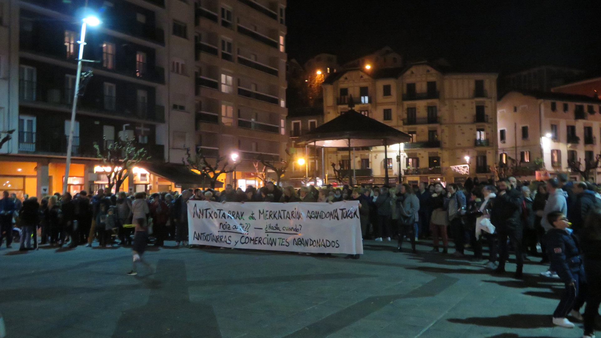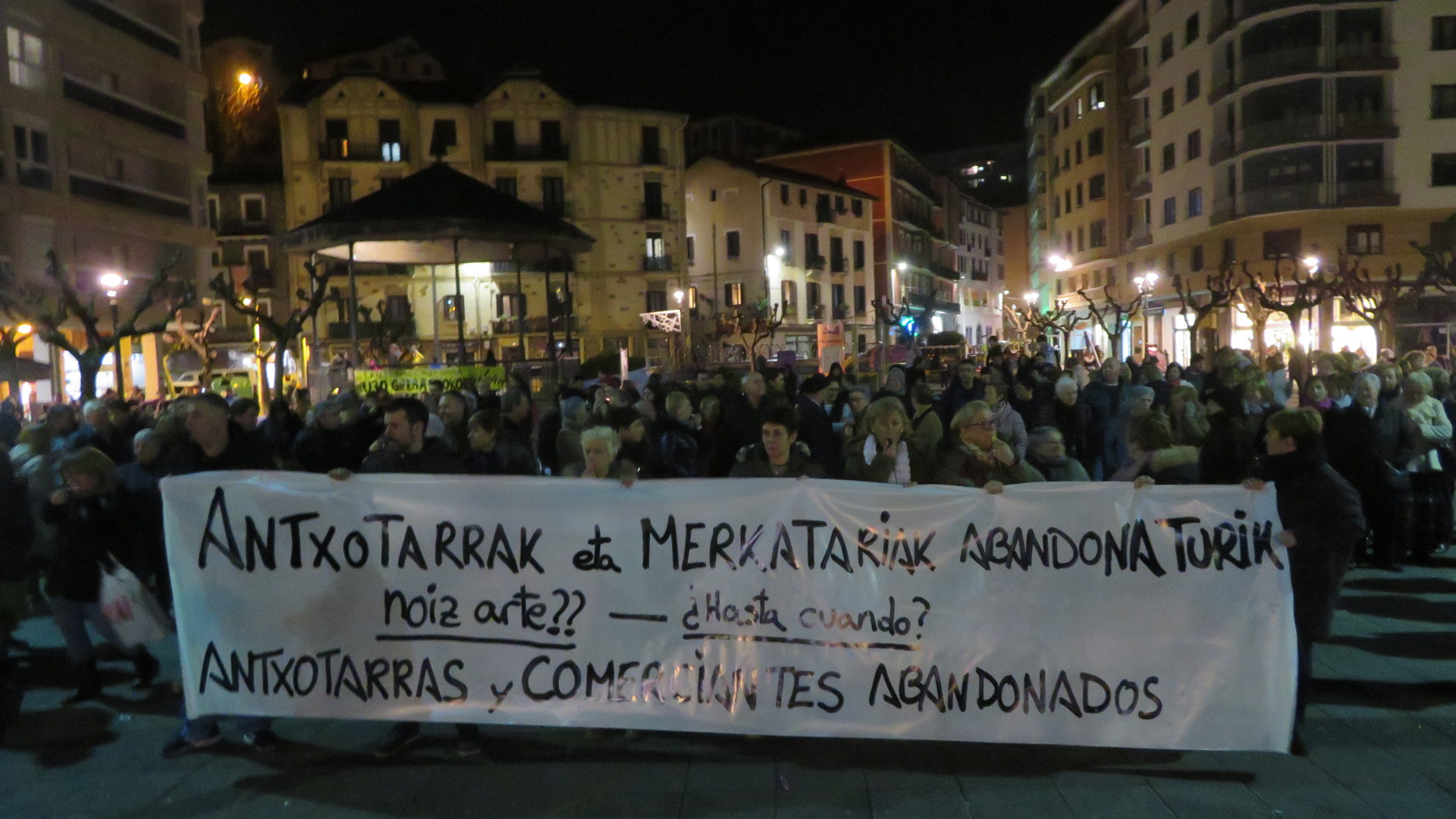 19:30ean hasi da elkarretaratzea. Zaratatsua izan da. Hasiera batean 250-300 inguru ziren barrutiaren epizentroa, Gure Zumardia, hartzen zuten herritarrak. Minutuak aurrera joan ahala biderkatu egin da kopuru hori, HITZAk egin duen estimazioaren arabera 500 bat izan direlarik bildu direnak. Zarata asko. Izugarria. Eta pankarta baten atzean ehunka herritar. Antxotarrak eta merkatariak abandonaturik gaude, zioen pankartak. Haurrak, helduak, adinekoak… Jendetsua izan da bilkura. Oso jendetsua.