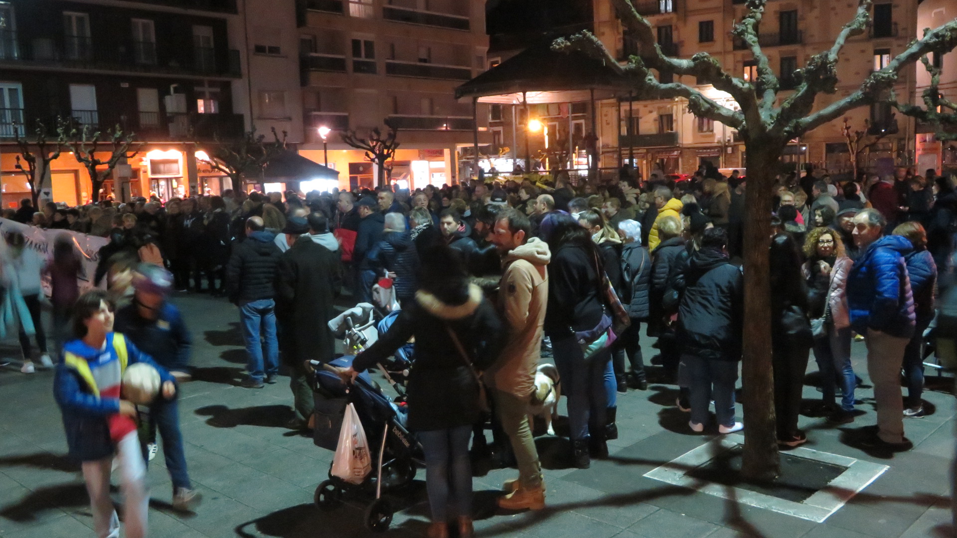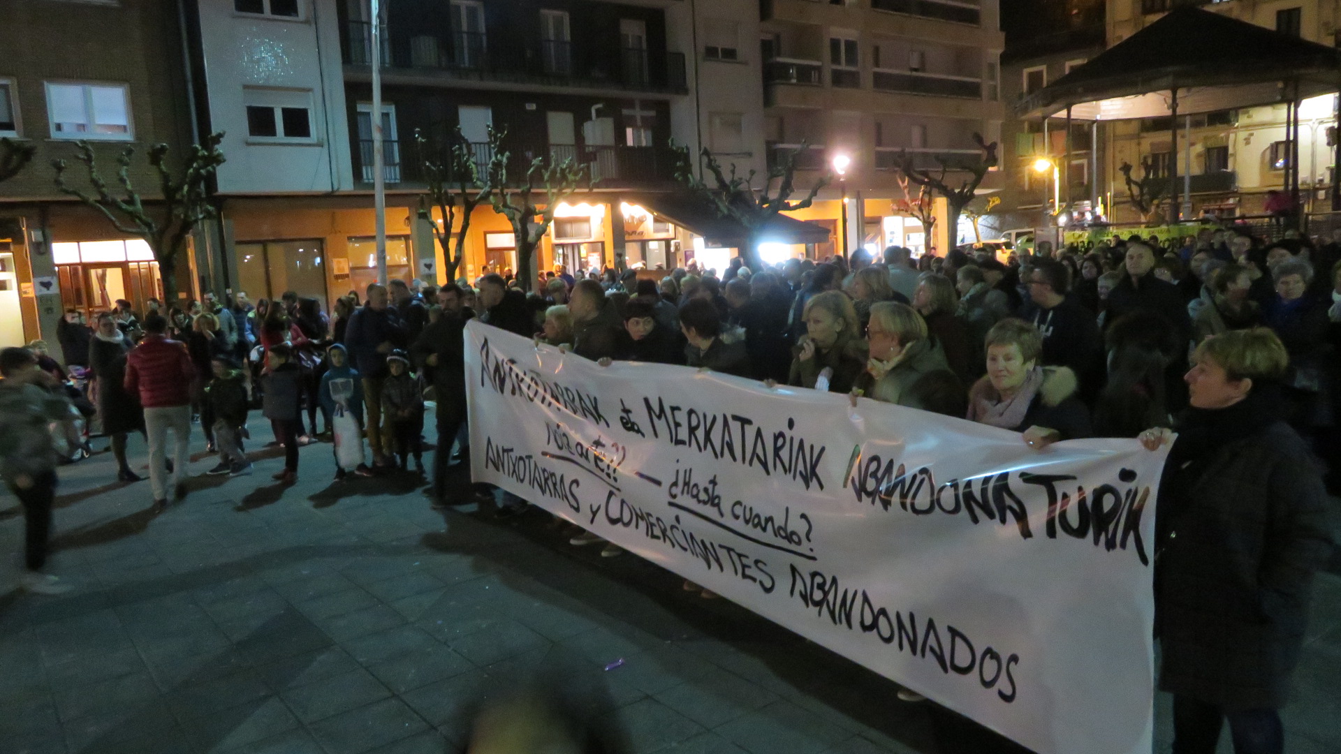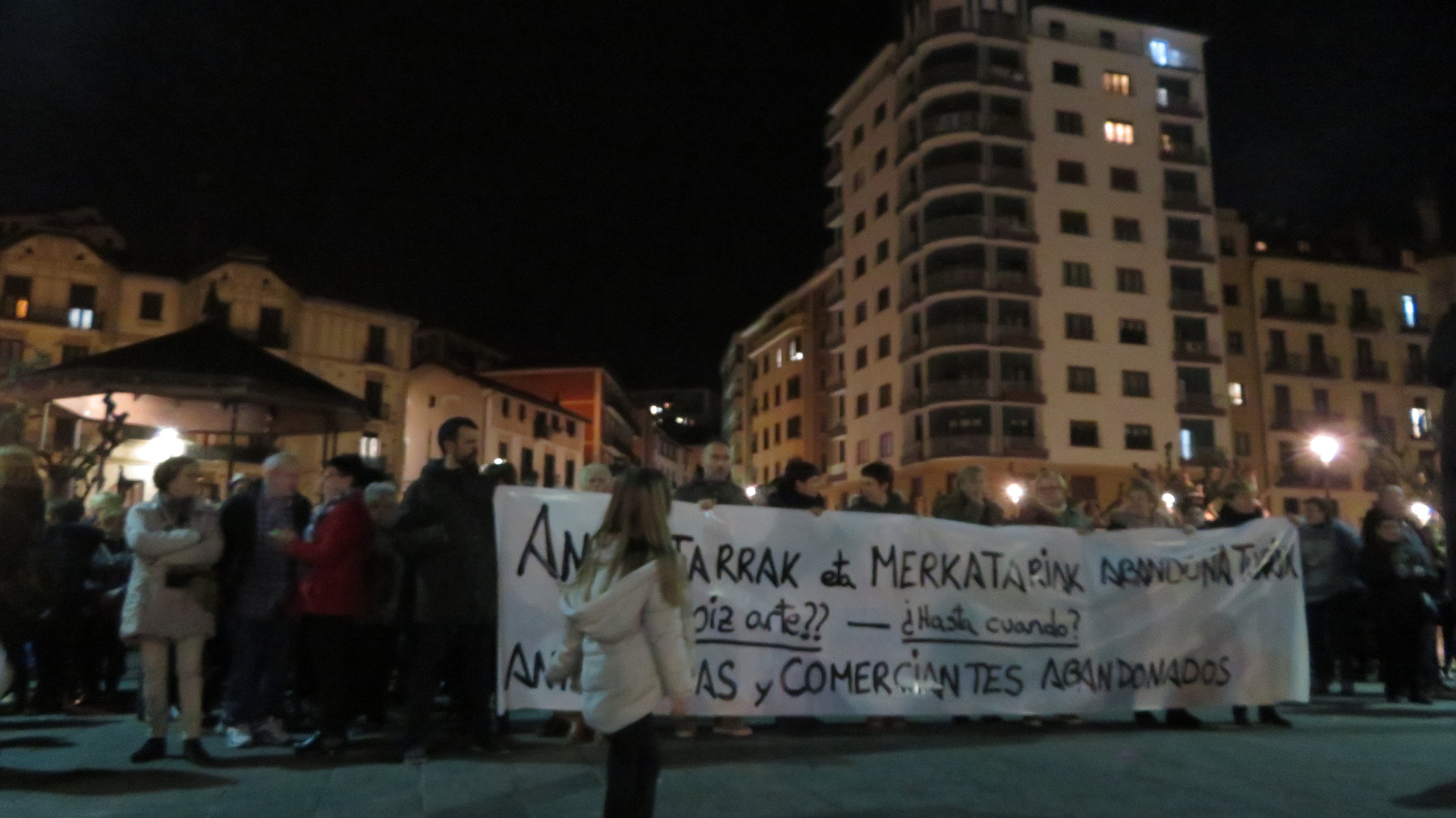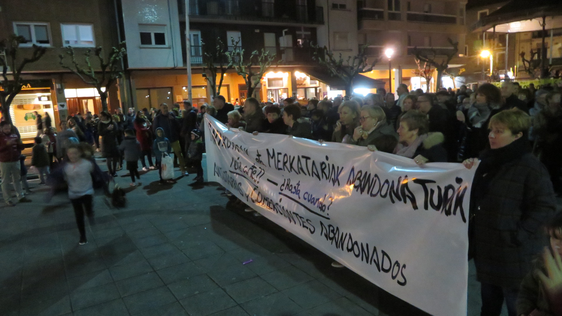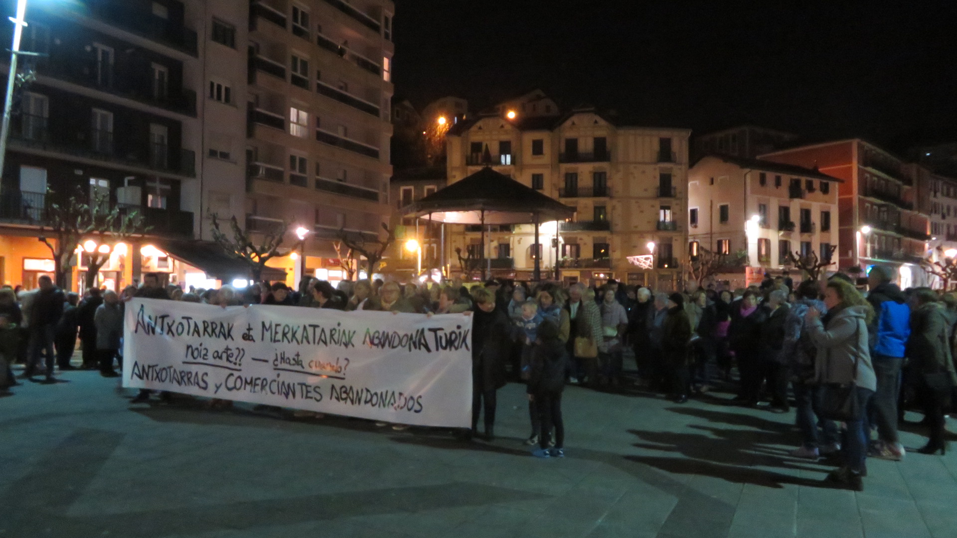 19:30ean hasi da elkarretaratzea. Zaratatsua izan da. Hasiera batean 250-300 inguru ziren barrutiaren epizentroa, Gure Zumardia, hartzen zuten herritarrak. Minutuak aurrera joan ahala biderkatu egin da kopuru hori, HITZAk egin duen estimazioaren arabera 500 bat izan direlarik bildu direnak. Zarata asko. Izugarria. Eta pankarta baten atzean ehunka herritar. Antxotarrak eta merkatariak abandonaturik gaude, zioen pankartak. Haurrak, helduak, adinekoak… Jendetsua izan da bilkura. Oso jendetsua.