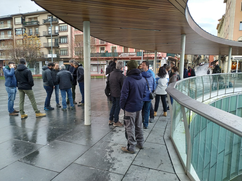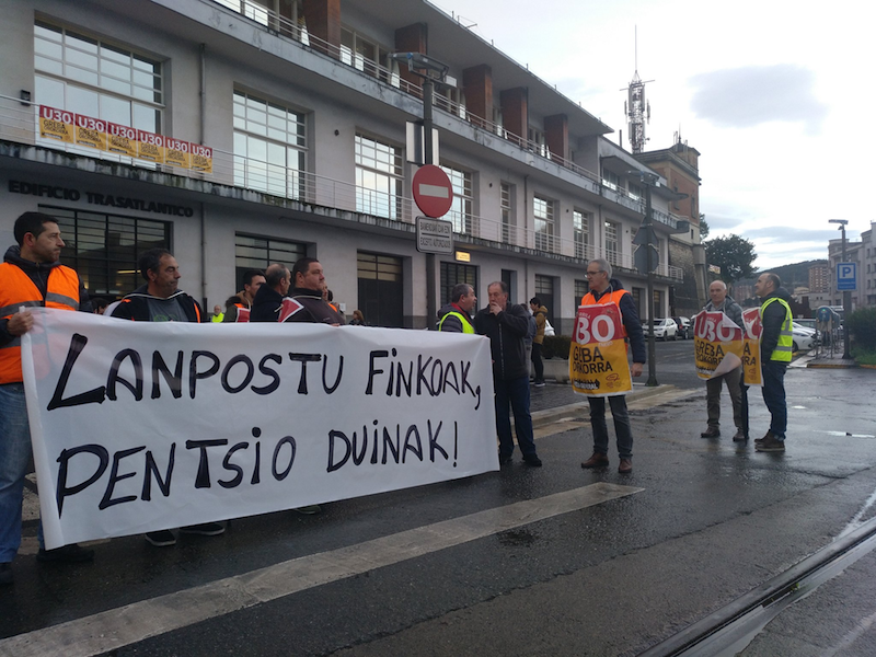 Pasaiako Portuko langileen elkarretaratzea. Herrietan goizerdian egingo diren mobilizazioen zain, industriaguneetan zentratu da batez ere grebalarien zeregina goizean zehar. Lehen balorazio moduan, Oiartzungo, Errenteriako eta Lezoko (lantegien %60 itxita) industrialdeetan jarraipena zabala izan da. Pasaiako portuan eragina nabaria da; Irunen, enpresa handietan gehiago egin dute bat grebarekin, txiki eta ertainetan baino. Jada herriko kaleetan daude informazio piketeak.