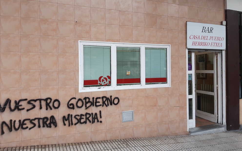 Grebaren egunean herriko etxean egindako pintaketa. Argazkia: PSE-EE Atzoko grebaren testuinguruan Errenteriako PSE-EEren egoitza “eraso” zutela salatu du alderdi sozialistak. Prentsa ohar baten bidez Morrongilleta kaleko 12. zenbakian kokatuta dagoen egoitzan pikete informatiboek pintadak egin eta petardoak jaurti zituztela esan du, eta gogor salatu. Herriko Etxearen paretan honakoa irakur daiteke: Zuen gobernua, gure miseria—gazteleraz idatzia— eta horrekin batera beren egoitzara zuzendutako hainbat petardo jaurti zituztela erantsi du Jose Angel Rodriguez PSE-EEko bozeramaleak.
