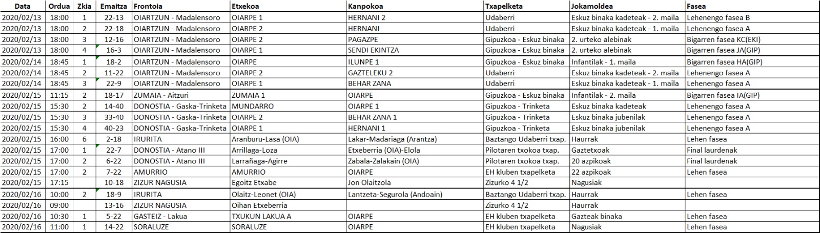 Oiarperen asteburuko partiden emaitzak (2020-02-17)
