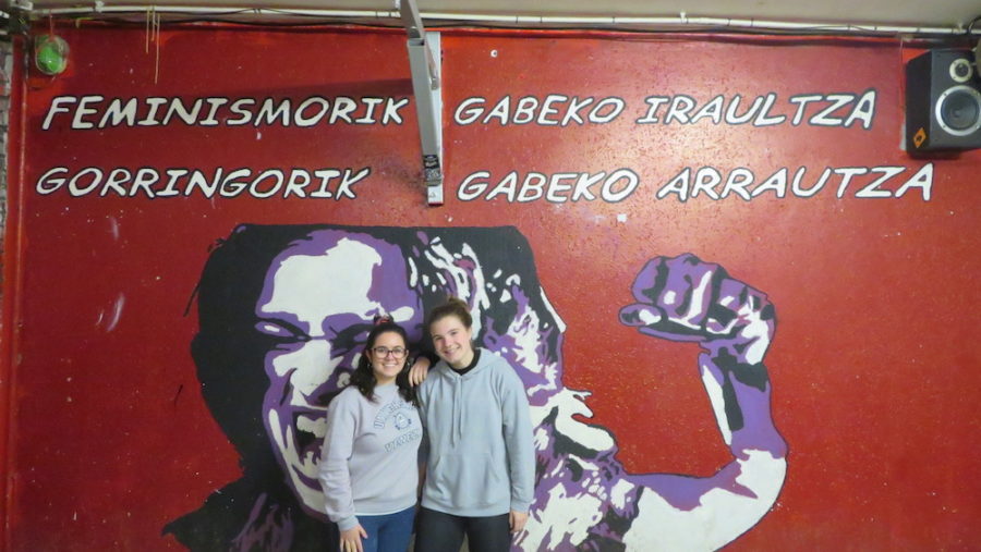 Ekiñe Rivas eta Laia Urretabizkaia, Zirikako kideak. Martxoaren 8a, Emakumeen Eguna, gainean da, eta Errenteria-Oreretako eragile feministak azken prestaketa lanekin dabiltza igandean kaleak aldarriz betetzeko.