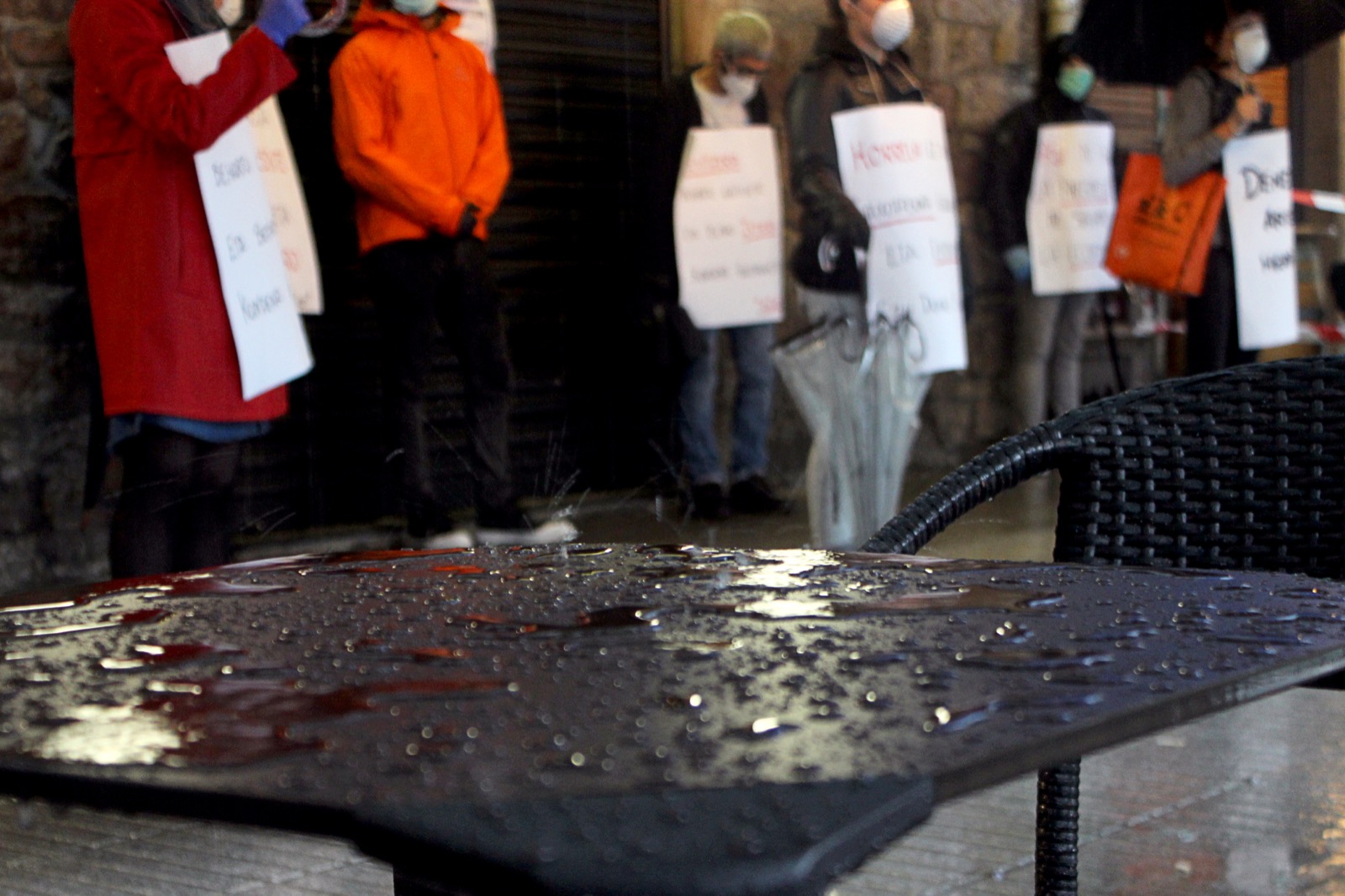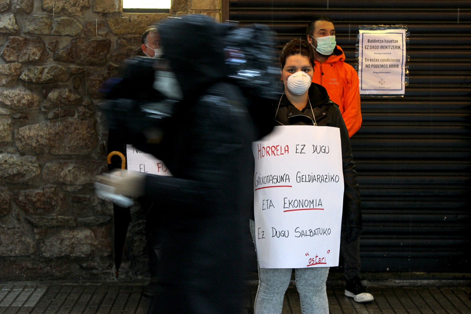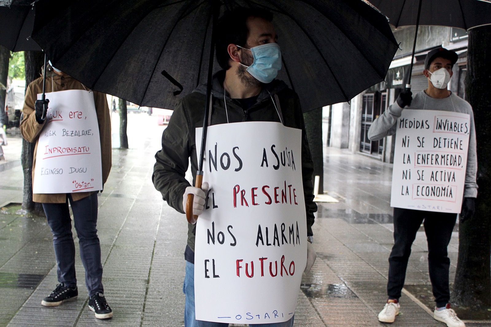 Beren establezimenduetako terrazak zergatik ez dituzten zabaldu azaltzeko, zein neurriarekin desadostasuna erakusteko agerraldia egin dute Ostariko 30 kideek gaur goizean. Zumardian egin dute agerraldia. Bertan erakutsi dute ezarritako baldintzekin ez duela zentzurik ateak zabaltzea. Gero, herrian barrena protesta egin dute, kartelak soinean, beren negozioak zabaltzeko baldintza duinak eta osasun bermeak eskatuz.