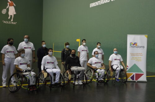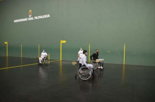 Aurkezpena amaituta gurpildun aulkian pilota erakustaldia egin dute eta bat egin dute Martinez de Irujo pilotariak, baita Aizpea Otaegi alkateak eta Maite Gartzia Kirol zinegotziak ere.