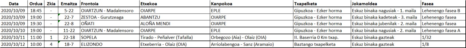 Oiarperen asteburuko partiden emaitzak (2020-10-13)