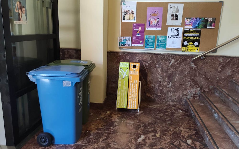 Udal euskaltegiaren sarreran ezarritako bilketa gunea. Etxeko hondakin arriskutsuen kudeaketa errazteko hainbat bilketa gune ezarri dira Pasaian: Antxoko HAZ bulegoan, Donibaneko kirolgunearen sarreran eta Trintxerpeko euskaltegiaren atondoan. Horietako bakoitzak bi edukiontzi izango ditu, led eta kontsumo baxuko lanpara mota ezberdinak zokoratzeko.