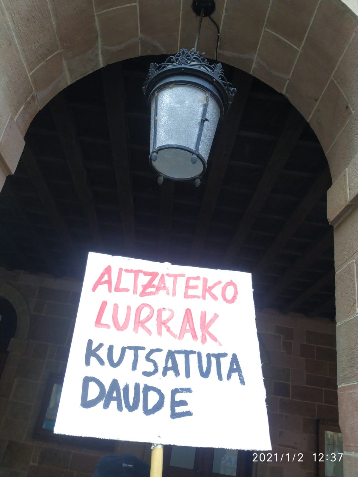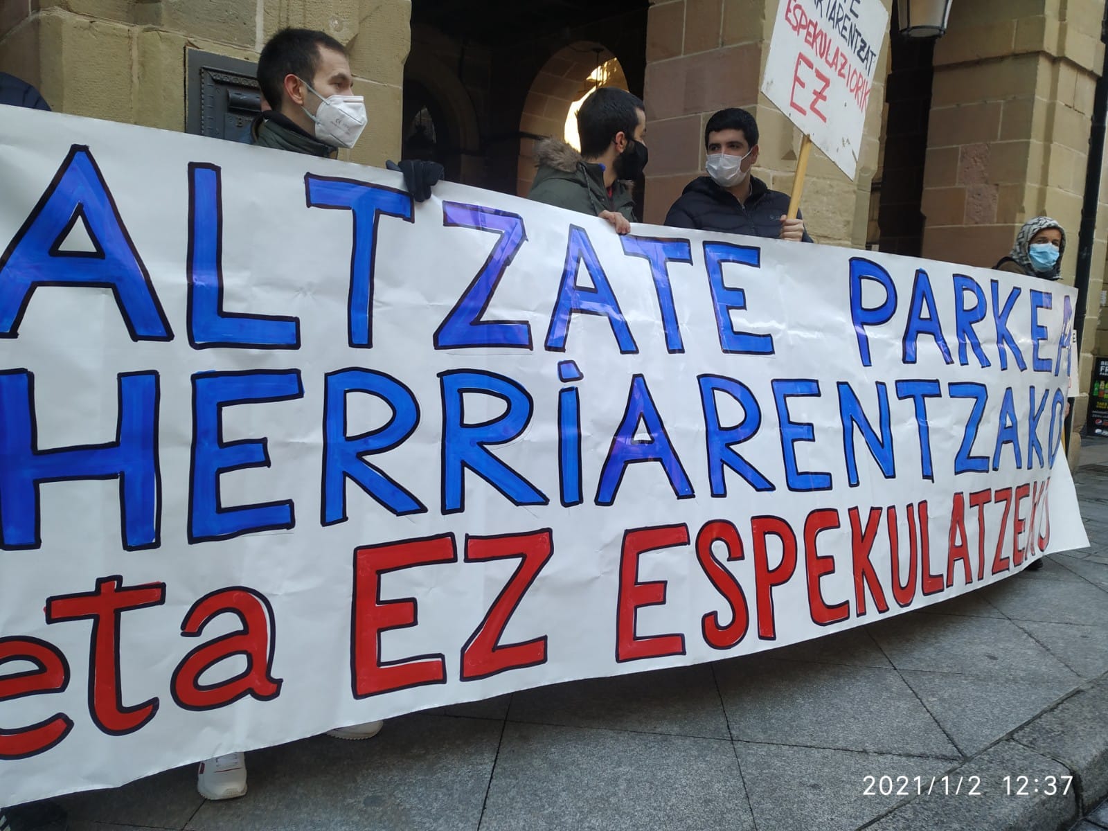 Udaletxeko balkoiraino eraman zuten eskaera, eskailera batekin igo eta pankarta bat zabaldu zutelako bertan. Foru Plazara ere zabaldu zuten protesta eta eskaerak; bertan du Altzaten etxebizitzak eraikiko dituen promotoreak bulegoa.