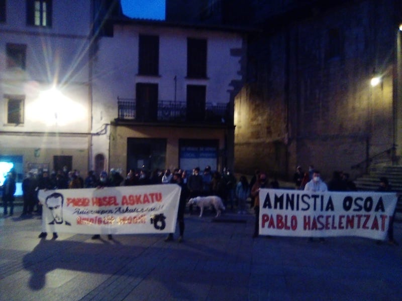 Elkarretaratzea egin zuten atzo arratsean Herriko Plazan. Abesten duenagatik baino, Hasel bere militantzia politikoagatik espetxeratu dutela adierazi zuten.