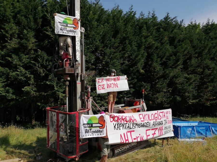 Oarsoaldeko AHTrik Ez taldeak protesta ekintza egin zuen atzo, Oiartzungo Mendigain eremuan zundaketak egiten ari direlako.