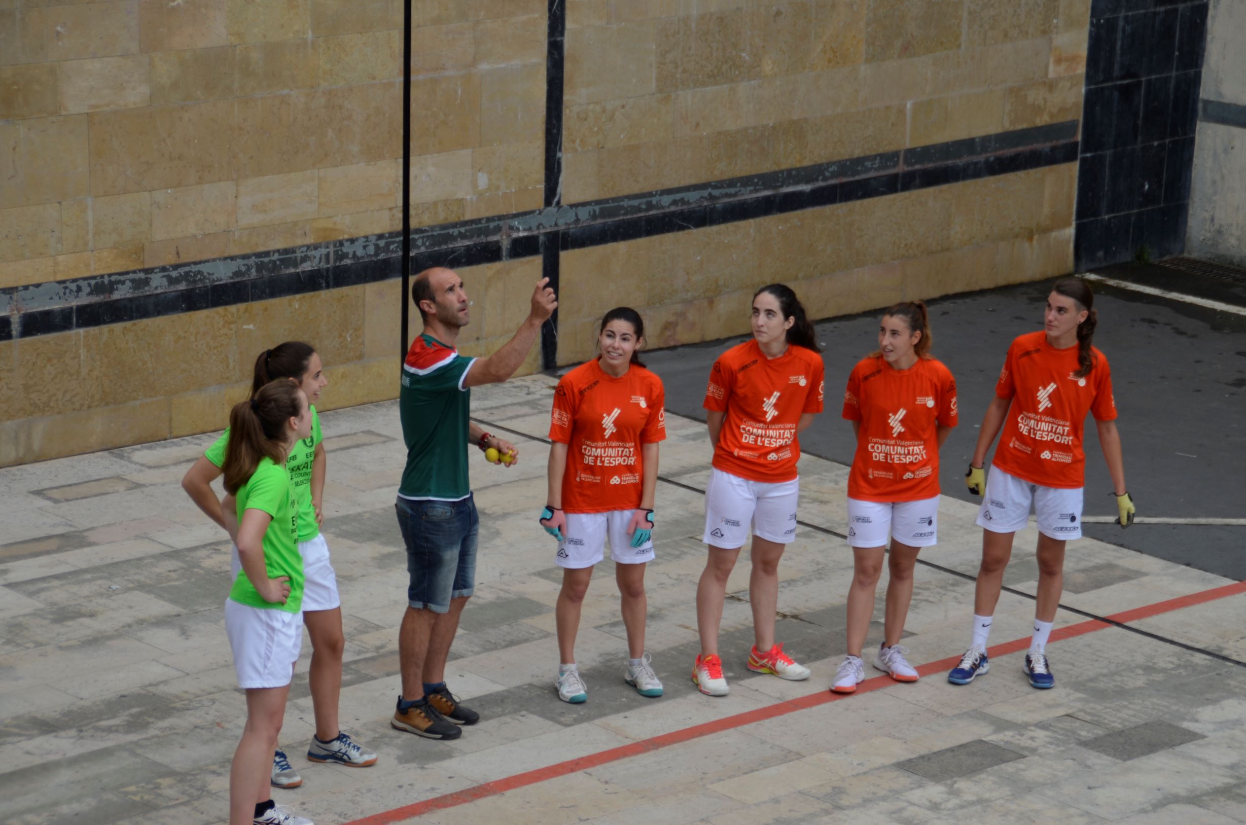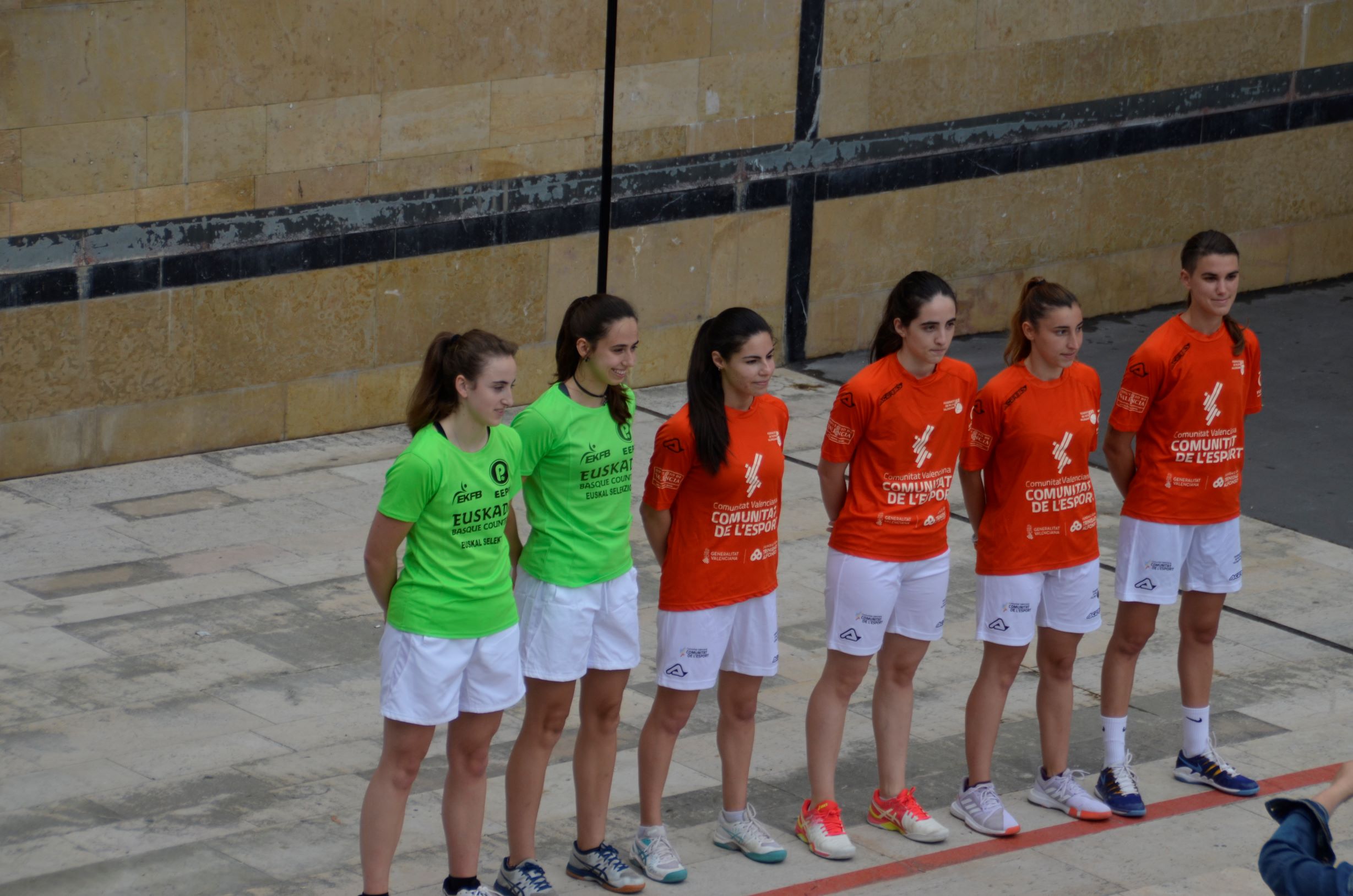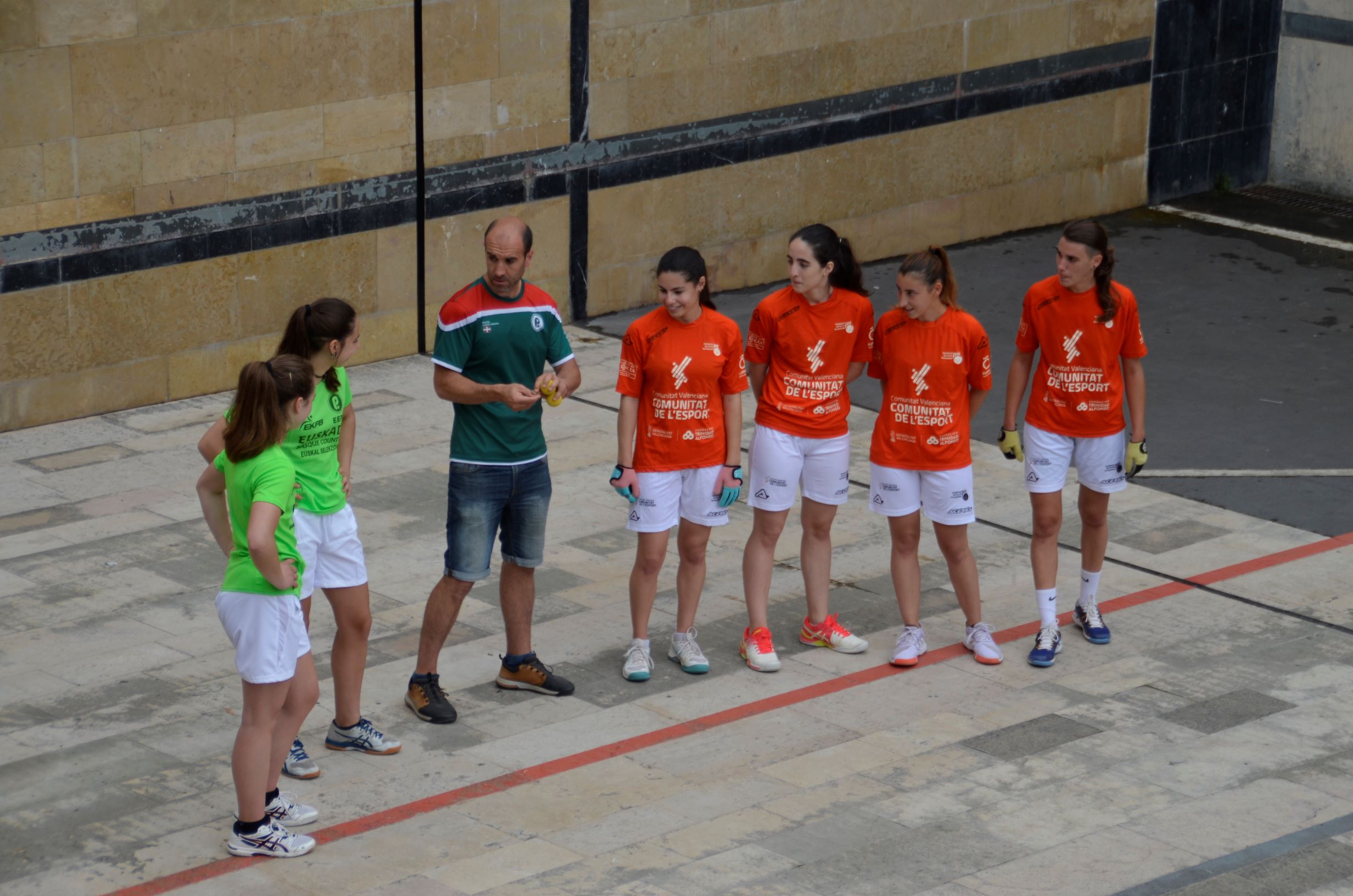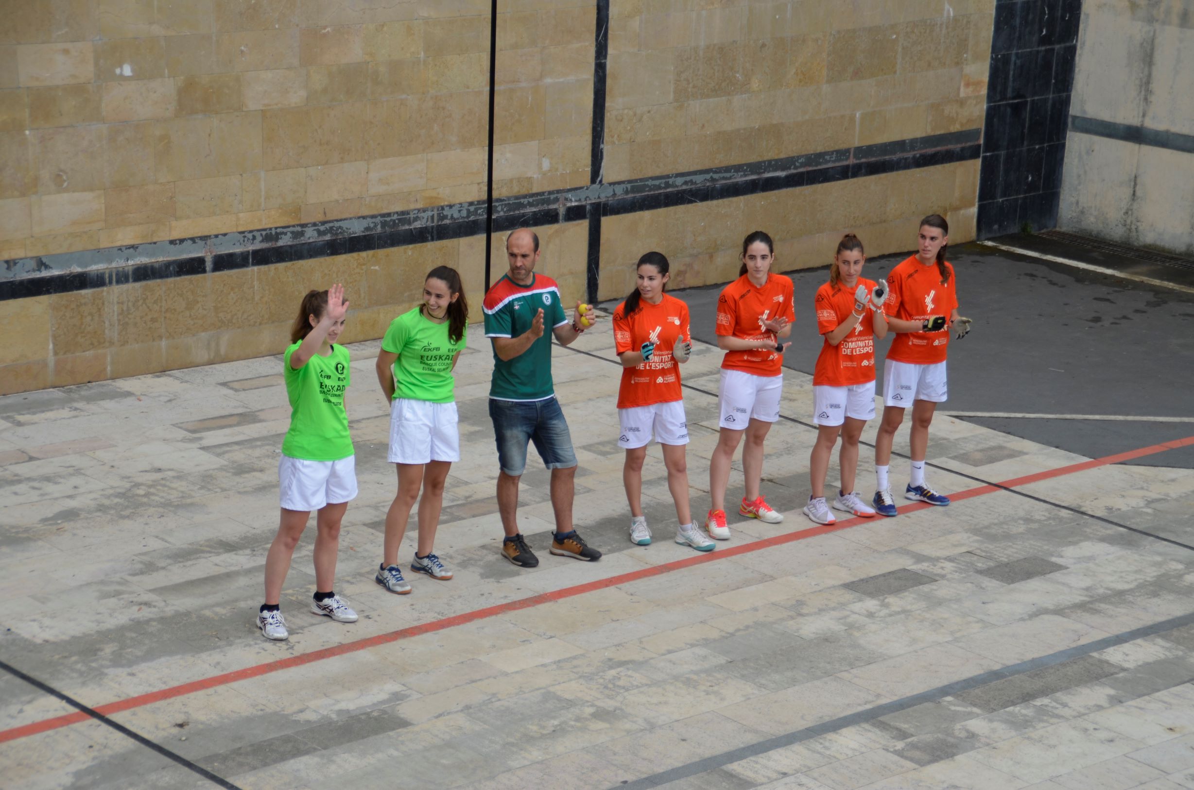 Emakumeak partiida hasi aurretik gaur eguerdian. Euskal Herriko Selekzioa eta Valentziakoa joko zuzeneko nazioarteko partidak jokatzen ari dira gaur eta bihar Oiartzungo Madalensoron. Bi herrialdeek egiten duten hirugarren topaketa da aurtengoa, Euskal Pilota Federakuntzak eta Federacio de Pilota Valencianaren iniziatibaz.