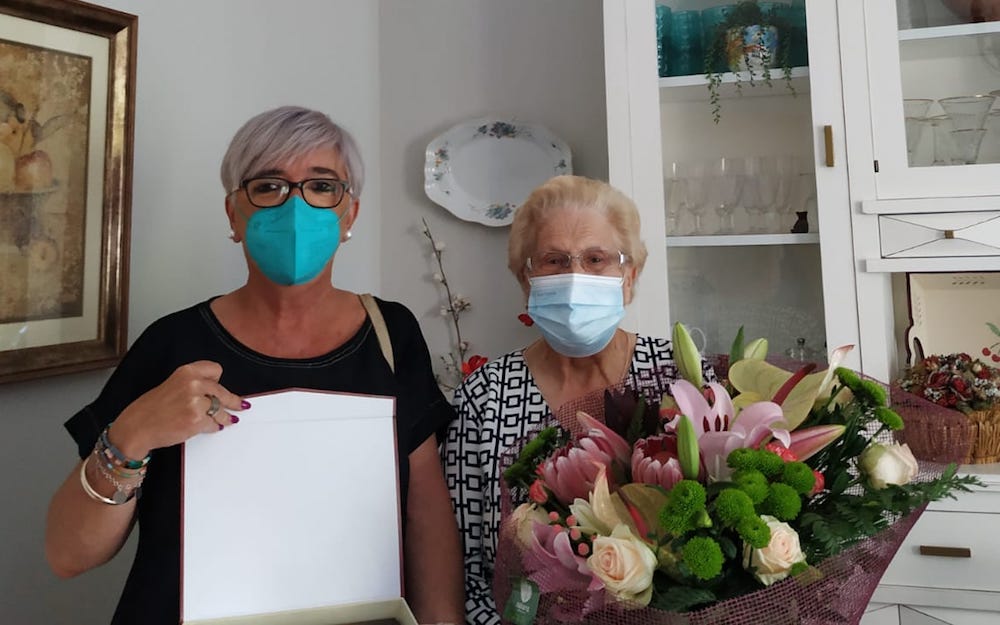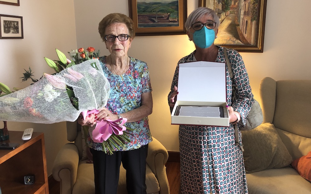 Mendeurrena ospatzeko, lore-sorta eta oroitzapen plaka bat eskura eman die Izaskun Gomezek Carmen Iragorri eta Victoria Sanchezi.