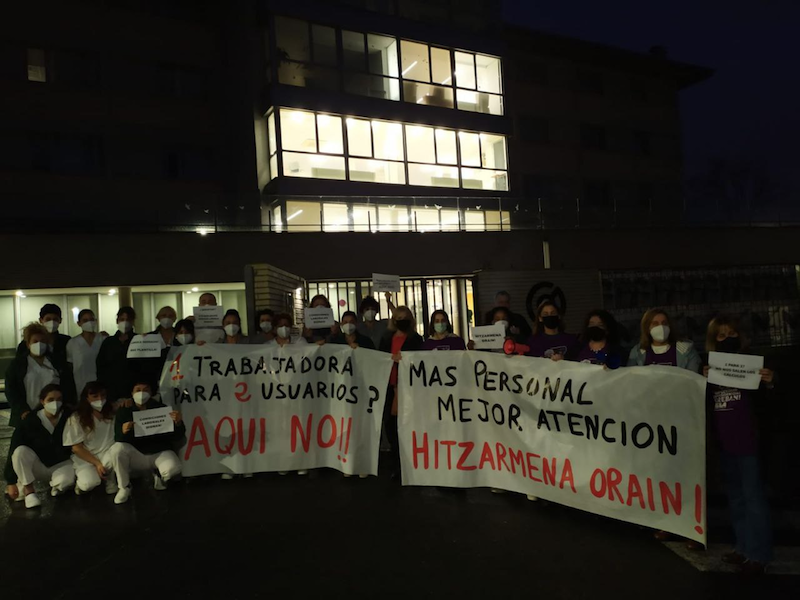 Hilaren 28rako eta azaroaren 12rako grebak deitu ditu ELA sindikatuak adinekoen egoitzetan. Horri begirako mobilizazioak egin dituzte gaur goizean.