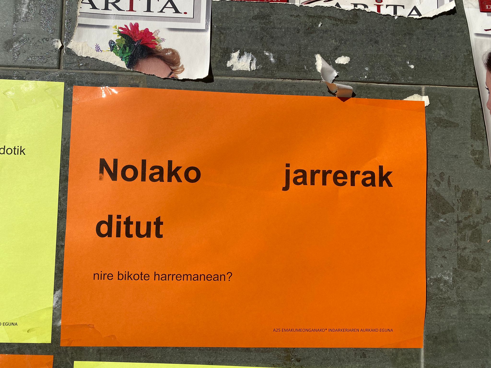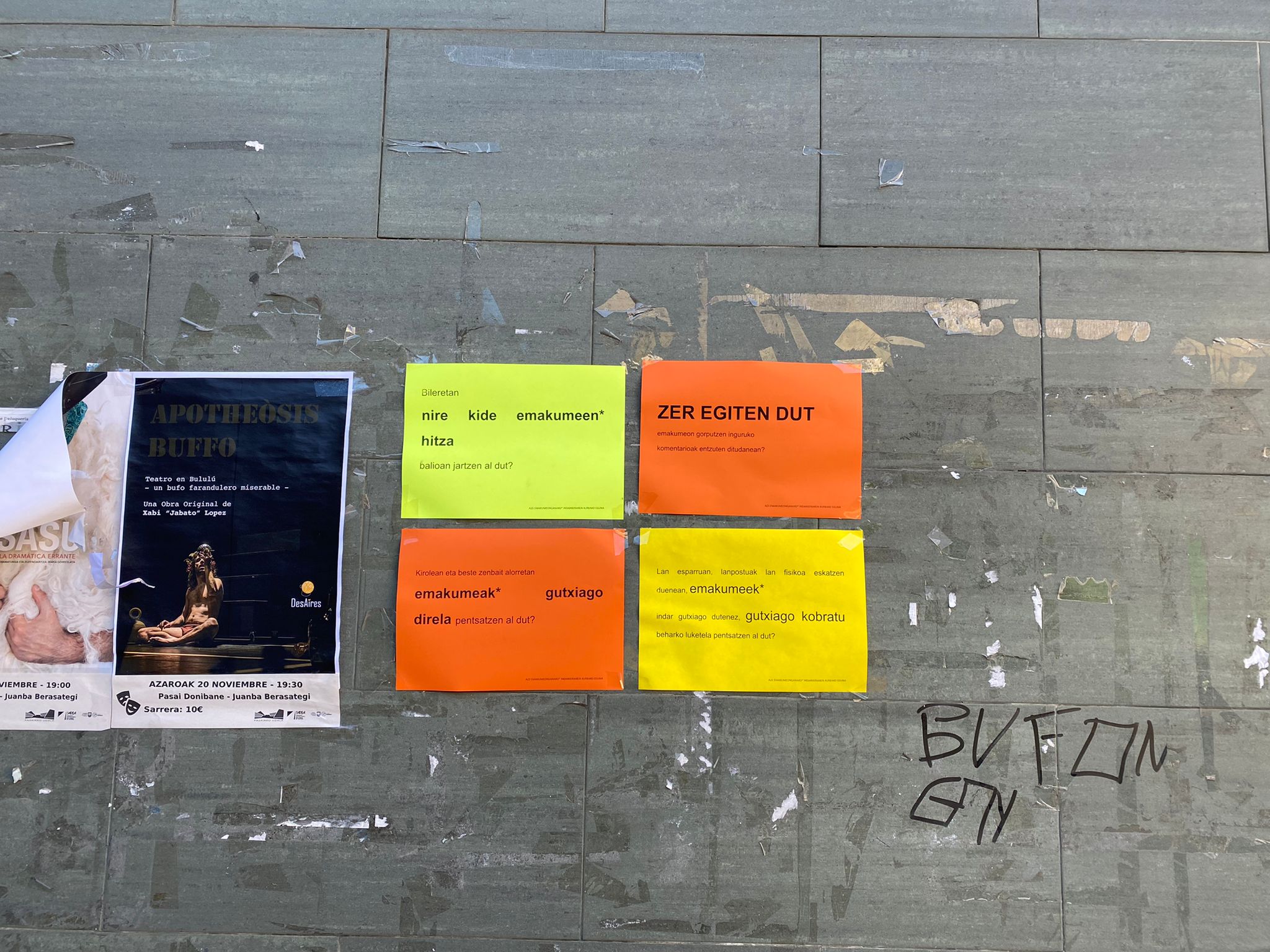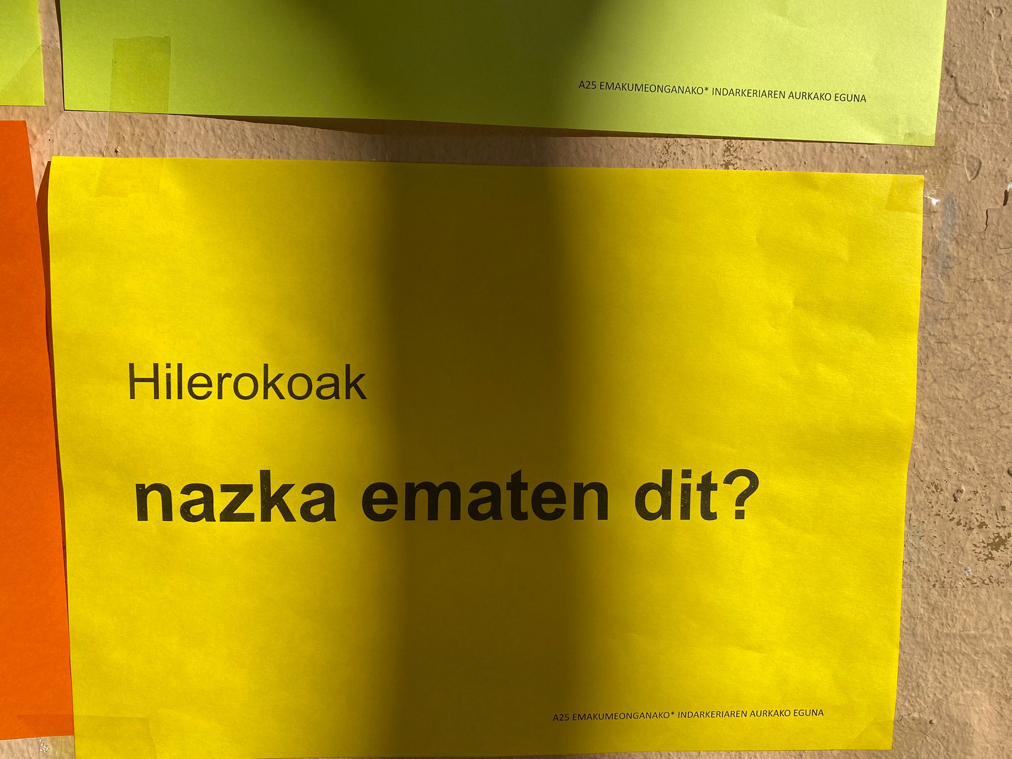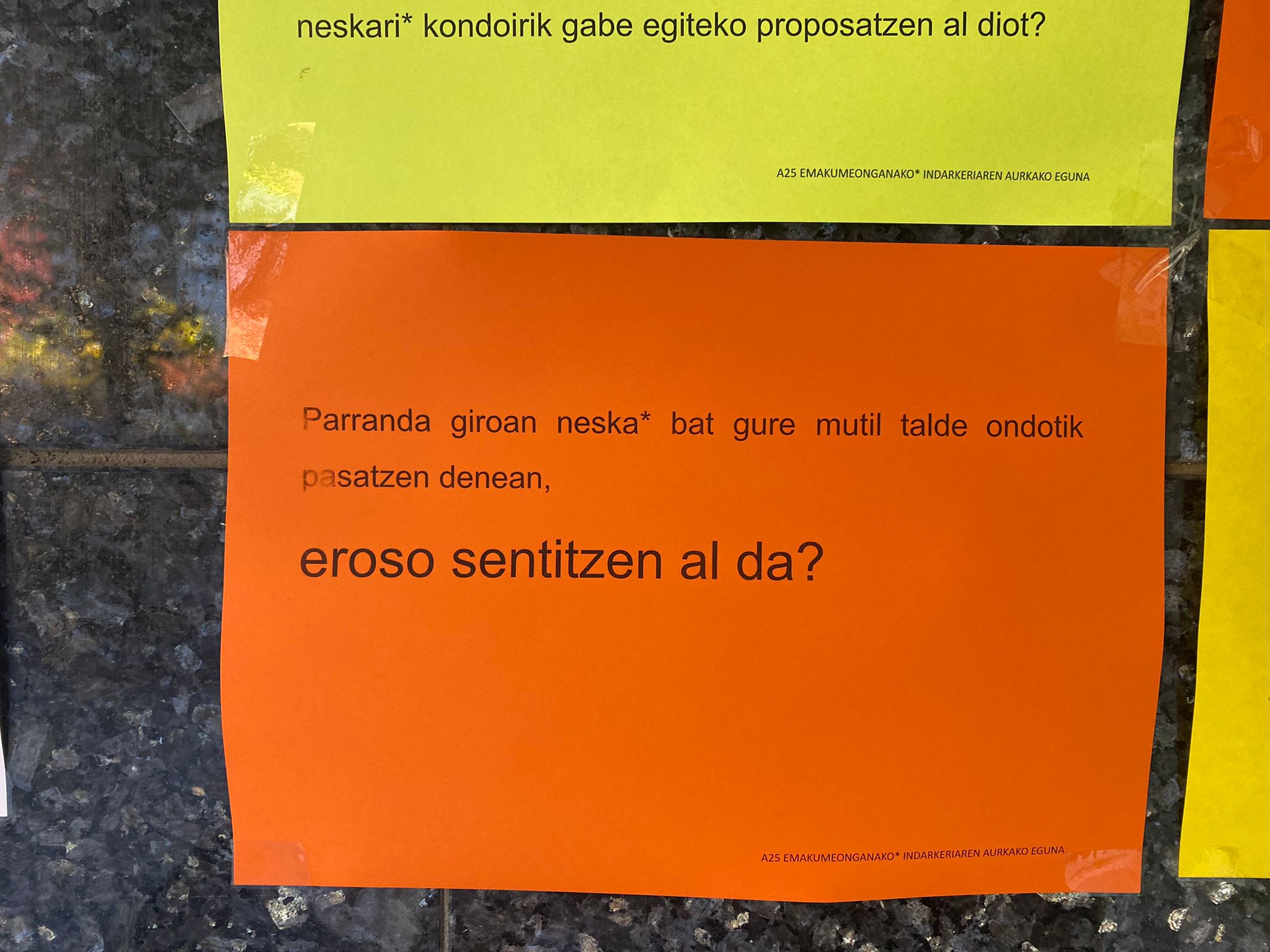 Gizartearen matxismo estrukturala elikatzen denok dugun erantzukizunaz pentsarazteko orotariko galdekizunak topa daitezke gaur barrutiko kaleetan; izan ere, eguneroko jarreren gainean hausnarketa egiteko mezudun kartelak baitira Antxo hartu dutenak. Hona hemen horietako batzuk: