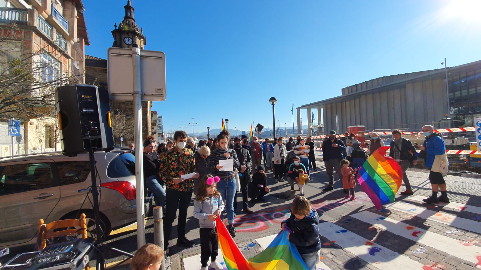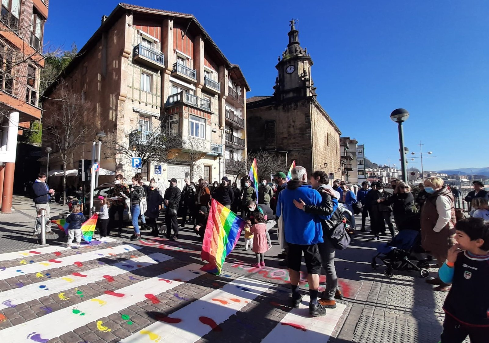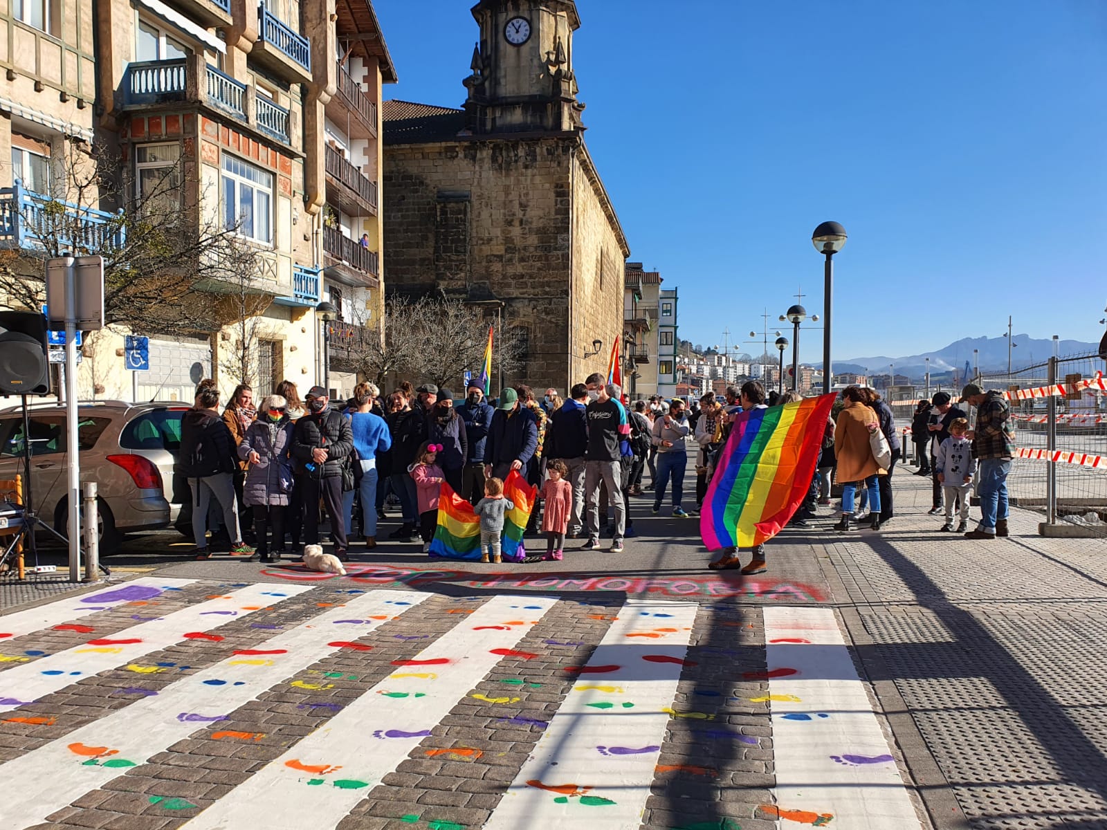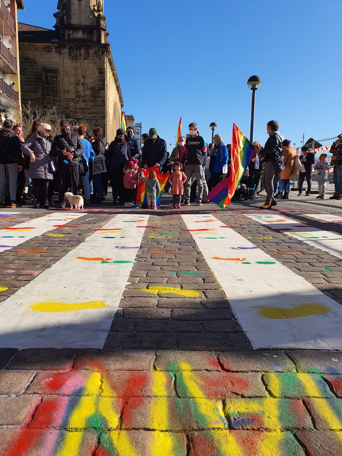 Zebrabide zuriaren gainean ortzadarraren koloreko urratsak margotu dituzte. Pasaiako LGTBIQ+ mugimenduak deituta, mobilizazioa egin dute gaur eguerdian San Pedron. Izan ere, Pasaiako Udalak aste honetan ortzadarraren koloreak dituen zebrabidea margotu du, zuriz. Koloretako urratsak margotu dituzte gaurko ekitaldian.