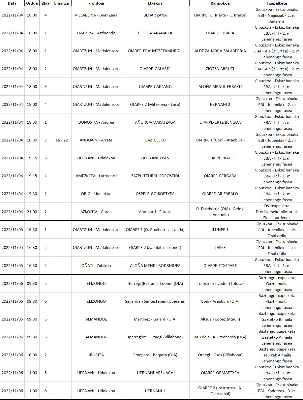 Oiarpeko pilotarien asteburuko karteleran 22 norgehiagoka agertzen dira. Gehienak lehenengo faseetako partidak izango dira, baina horietako lau zirt edo zart egitekoak izango dira.