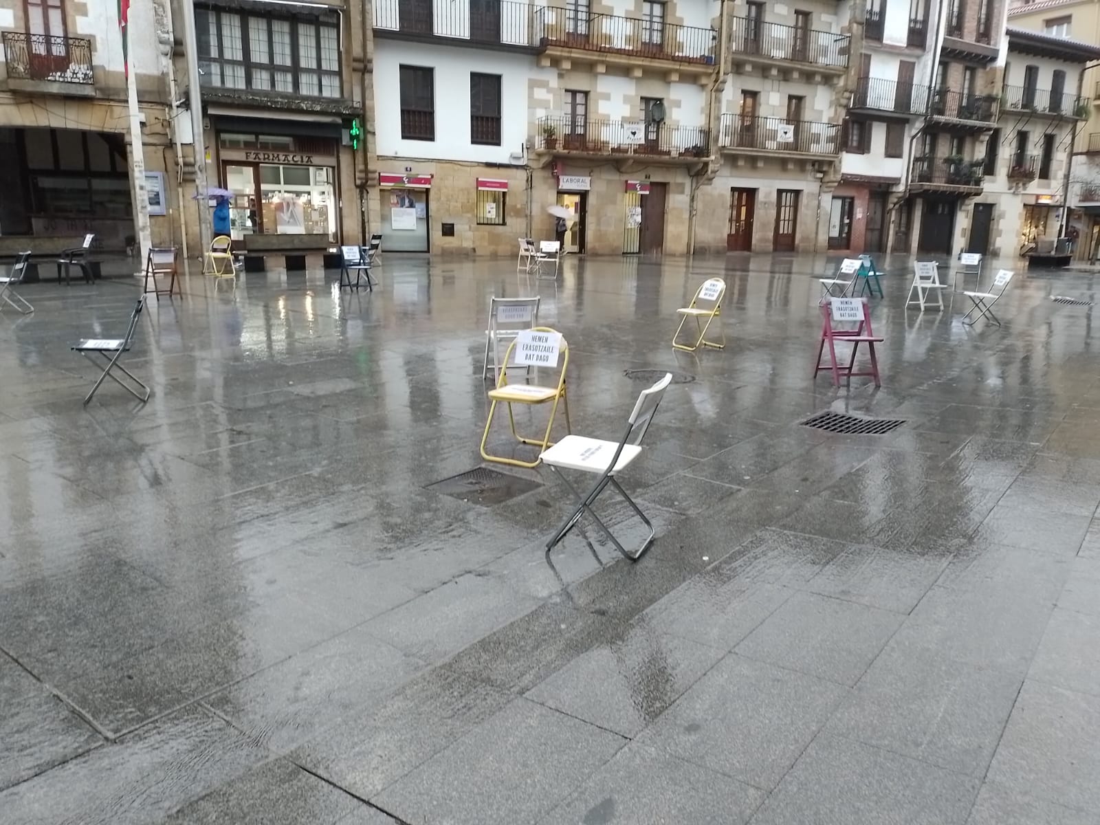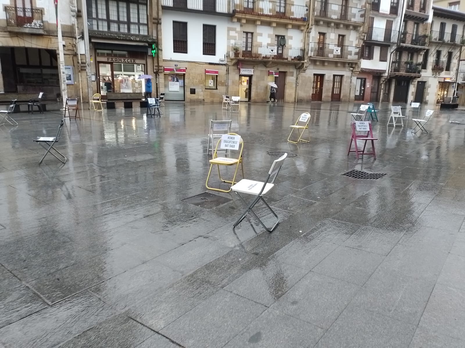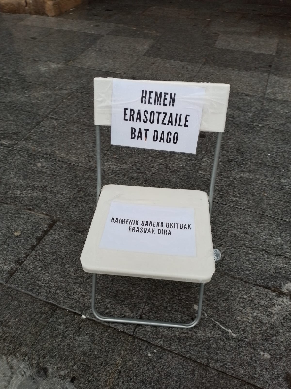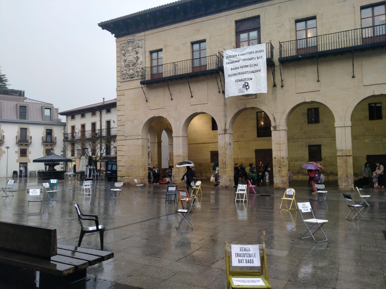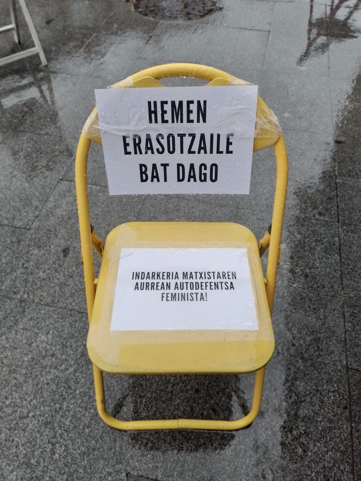 Aulki bakoitzak esaldi bat dauka: eraso mota guztiak ikustarazteko testuak; egunerokotasuneko erasoetatik hasi eta urruntze aginduetara iristen diren erasoak; erasoen kopuruak… Gaur arratsaldean eserleku horiek pertsonifikatu egingo dituzte, arropa zein beste hainbat elementu jarriz.