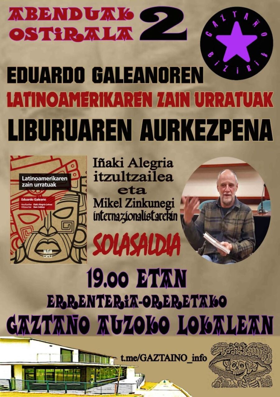 Eduardo Galeano uruguaitarraren liburua euskaratu duen Iñaki Alegria itzultzailea bertaratuko da, eta harekin batera, Mikel Zinkunegi internazionalista izango da.