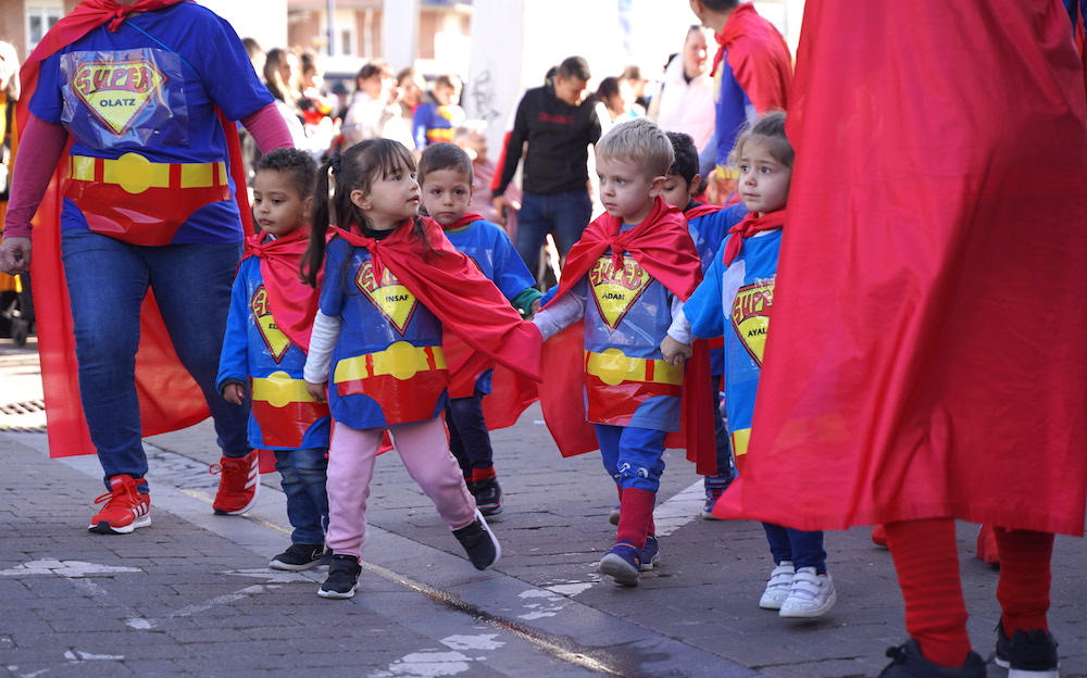 Koldo Mitxelena ikastetxeko txikienek herriko kaleak kolorez bete dituzte gaur goizean, inauteri desfile erraldoia egin dute. Ikastetxetik abiatu dira, gurasoz betetako ibilbideari ekin diote.