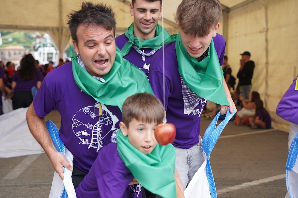 Zaku lasterketa launaka egin behar izan dute, eta batek baino gehiagok probatu du saioan zoruaren gogortasuna orekari ezin eutsita lurrean bukatu duelako; hori bai, erorikoak ere, elegante. Lasterketaren muturretako batean, sagarra zintzilik zuten zain, eta hozka egin behar zioten, eskuak erabili gabe; hor ere, trebeak, baten batek azkar sumatu baitu bidea hutsik ez egiteko. Talde irabazlea proba horretan, urdina izan da; psikomotrizitate fina dutela erakutsi baitute. Aulkiaren jokoa, sokatira… umorez eta jai giro ¡ederrean egin dituzte jokoak.