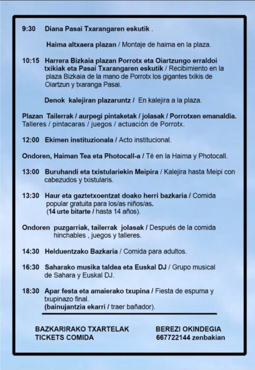 Plazako oholtzan “herri txiki guztien askatasuna” aldarrikatu du Porrotxek eta nagusitu egin dira ere Sahara libre uzteko oihuak. Ekitaldia bukatzerakoan denetariko jarduerak egiteko aukera eskaini dute, tailerrak edo tea hartzeko aukera esaterako.