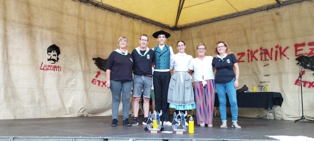 Dantza txapelketa irabazleak, antolatzaileekin. Lezoko santakrutzen larunbatean, dantzak festetan beharrezko eta ezinbesteko duen tokia izan zuen. Batetik, XII. Muxiko Egunaren barruko dantzaldia egin zuten Gurutze Santuaren plazan Lezoko Dantzazaleen ekimenez. Bestetik, arratsaldean jada, herriko erdiguneko plazak Dantza Solte Txapelketa jaso zuen, lezoarrak protagonismoarekin fandangoa eta arin-arina dantzan.