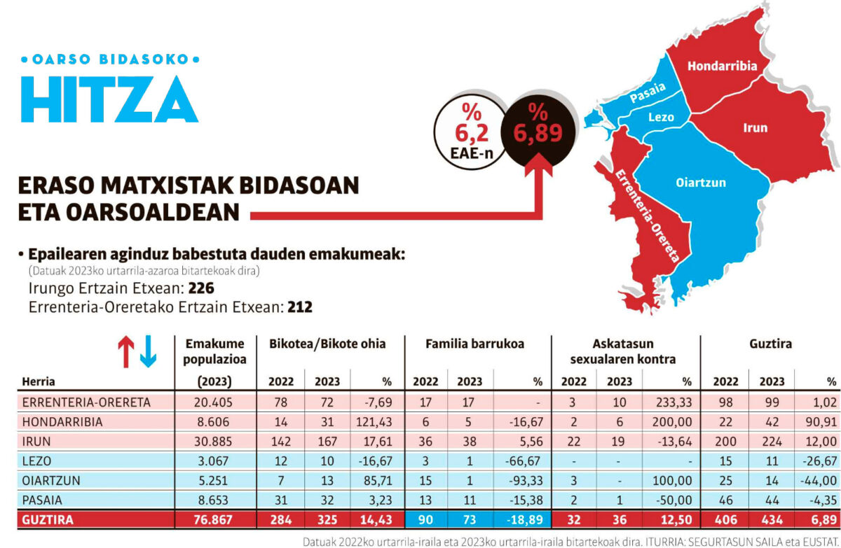 - Hondarribia: 2022tik 2023ra %90,91 igo dira indarkeria matxistagatik jarritako salaketak Hondarribian. Bikote edota bikote ohiek egindako salaketak, iaz, 14 izan ziren, eta 2023an 31 salaketa berri jarri dira. Horrek %121,43ko igoera adierazten du. Bestetik, askatasun sexualaren kontrako salaketak %200 igo dira. Iaz, bi salaketa jarri ziren herrian, eta aurten sei izan dira egindako salaketak, eta, beraz, %200 hazi da salaketa horien kopurua. Familia barruko salaketei dagokienez, %16,67 jaitsi dira, iaz sei salaketa jarri baitziren eta aurten bost izan dira salatutakoak.