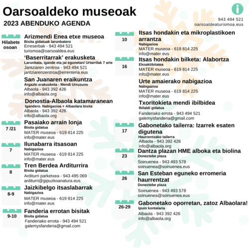 Oarsoaldea Turismoaren laguntzarekin osatu dute agenda Arizmendi Enea etxe museoak, Jantziaren zentroak, Albaolak, MATER museoak, Arditurri parketxeak, Fanderiako errotak eta Soinueneak.