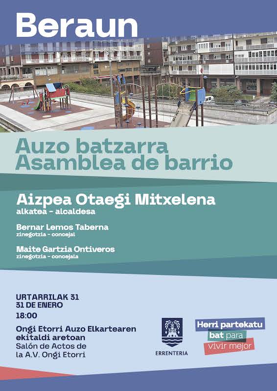 Asteazkenean, hilak 31, egingo dute auzo batzarra Beraunen. Ongi Etorri auzo elkartean izango da 18:00etan hasita.