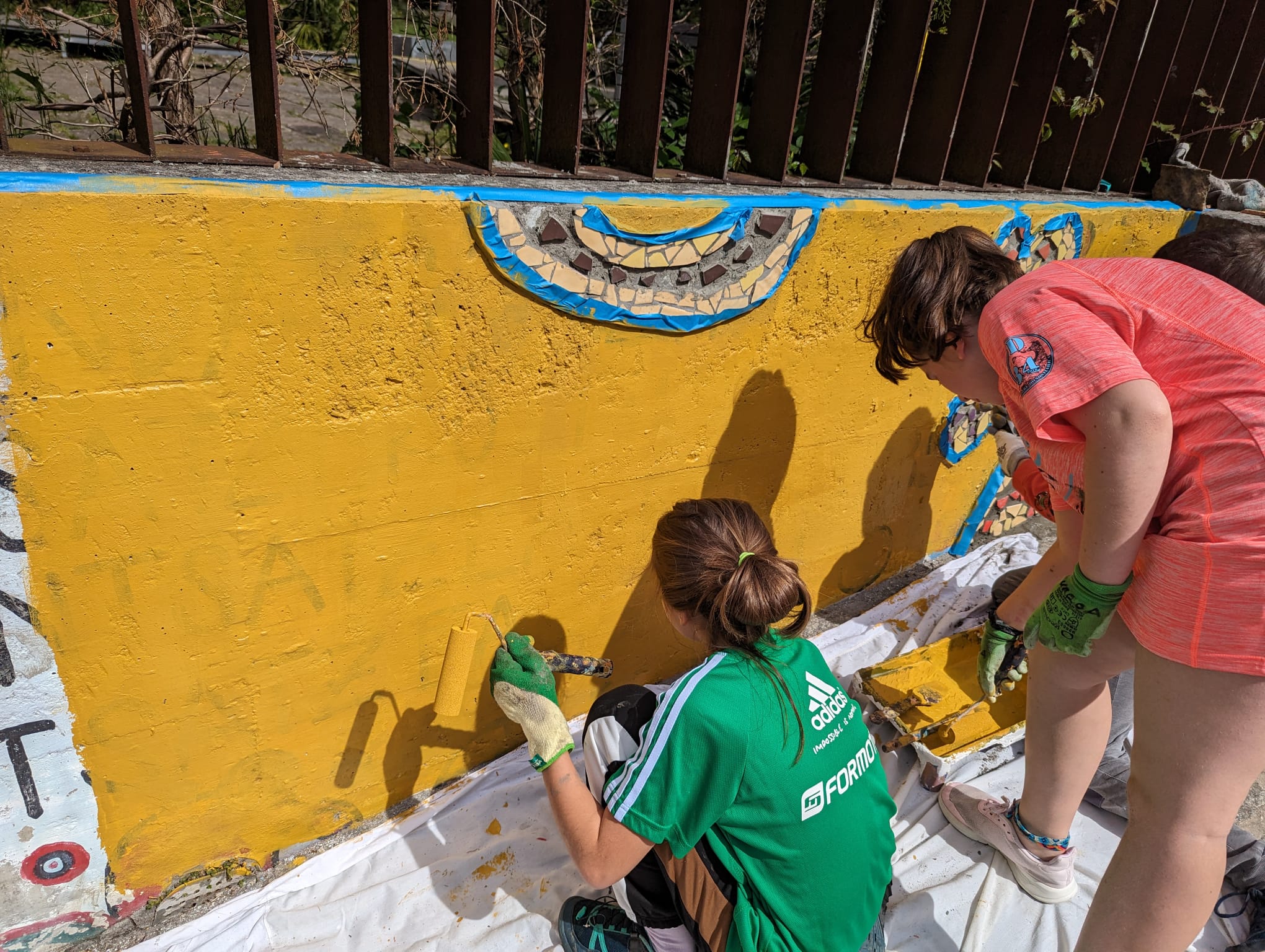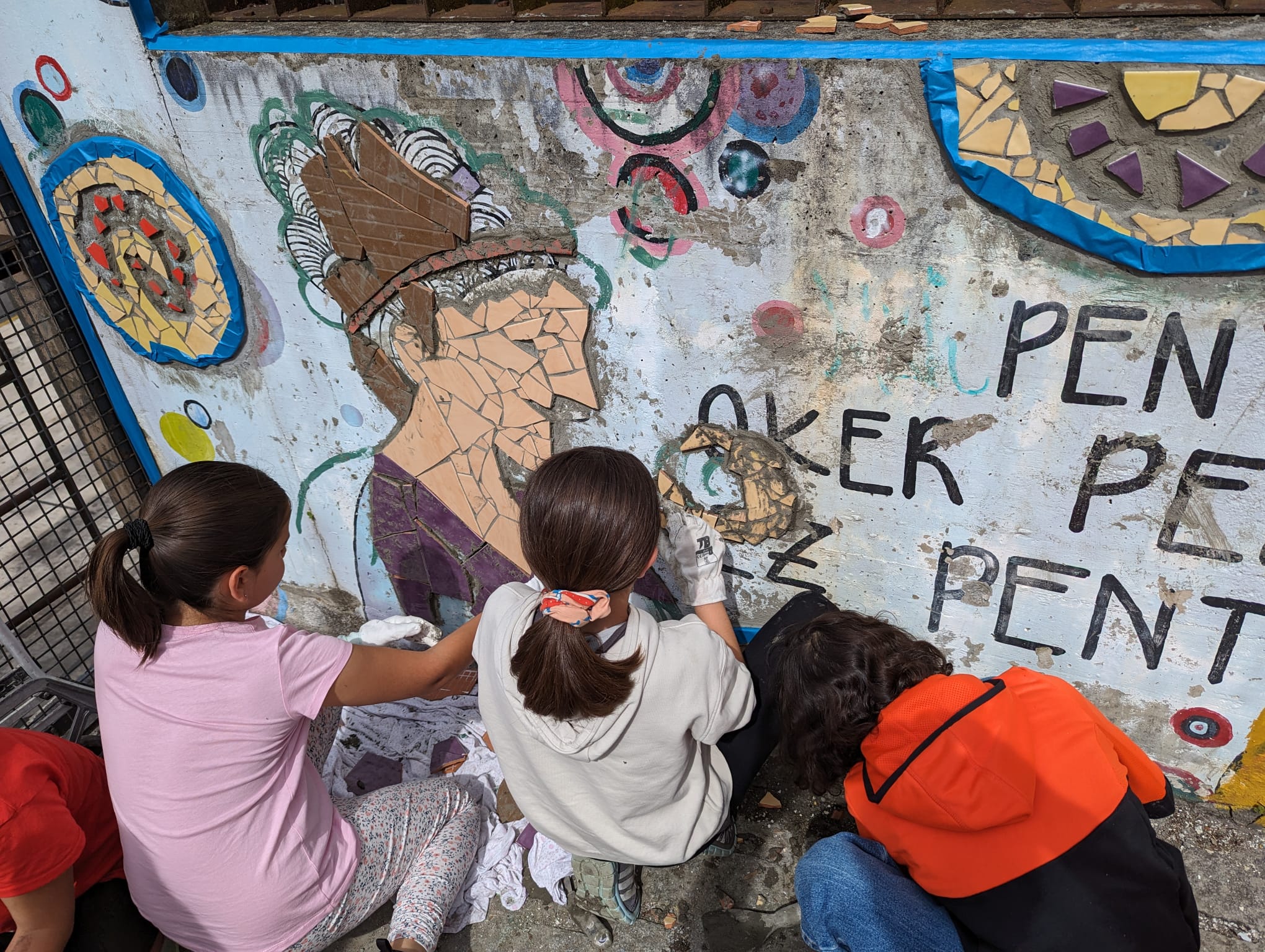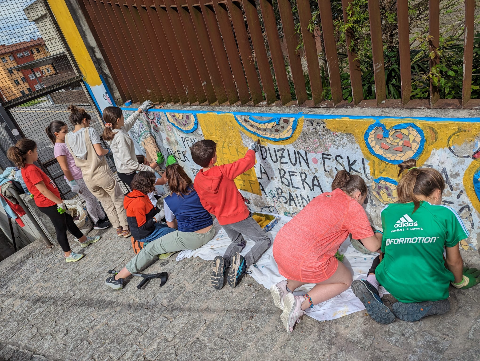 Igandeetako haur filosofia saioetako kideak ari dira txokoa zaharberritzen, Alaia Gaztelumendiren gidaritzapean. Mosaikoak egiten ari dira.