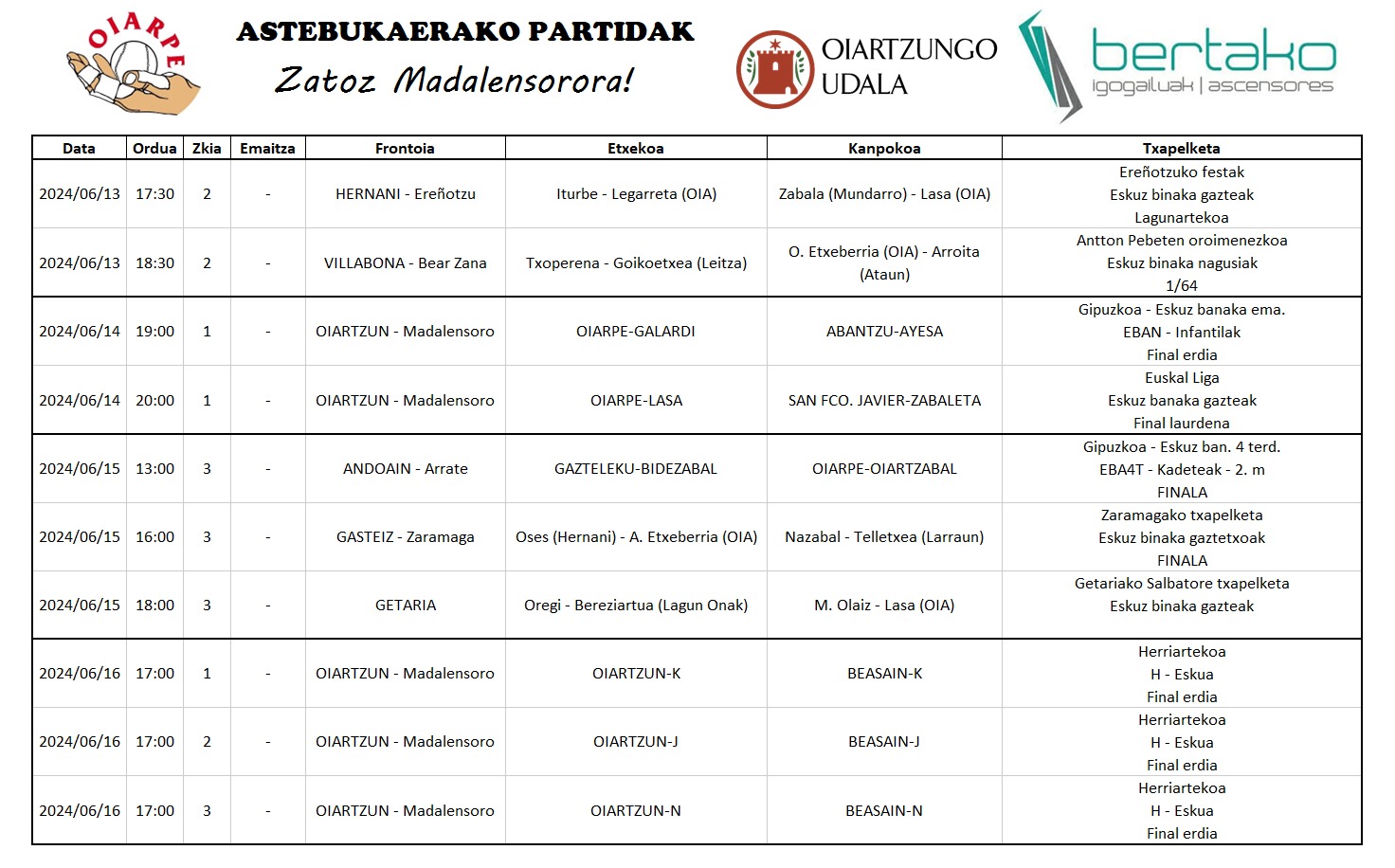 Gaur arratsaldean bi partida jokatuko dituzte, Madalensoron. Horietako bat finalerdia izango da, eskuz banakako Haur Mailako txapelketakoa. Oiarpeko Galardi Abantzuko Ayesaren kontra arituko da, 19:00etan hasita. Bukatzean, Lasa oiartzuarrak San Francisco Javier taldeko Zabaletaren kontra neurtuko ditu indarrak, Gazte Mailako Euskal Ligako finalerdian.