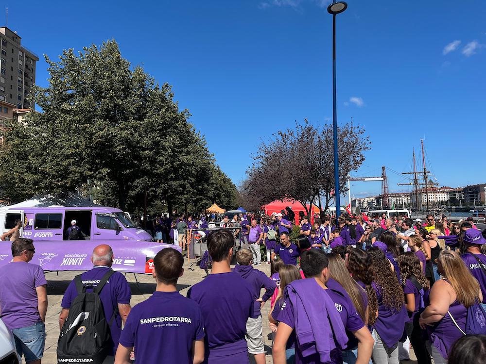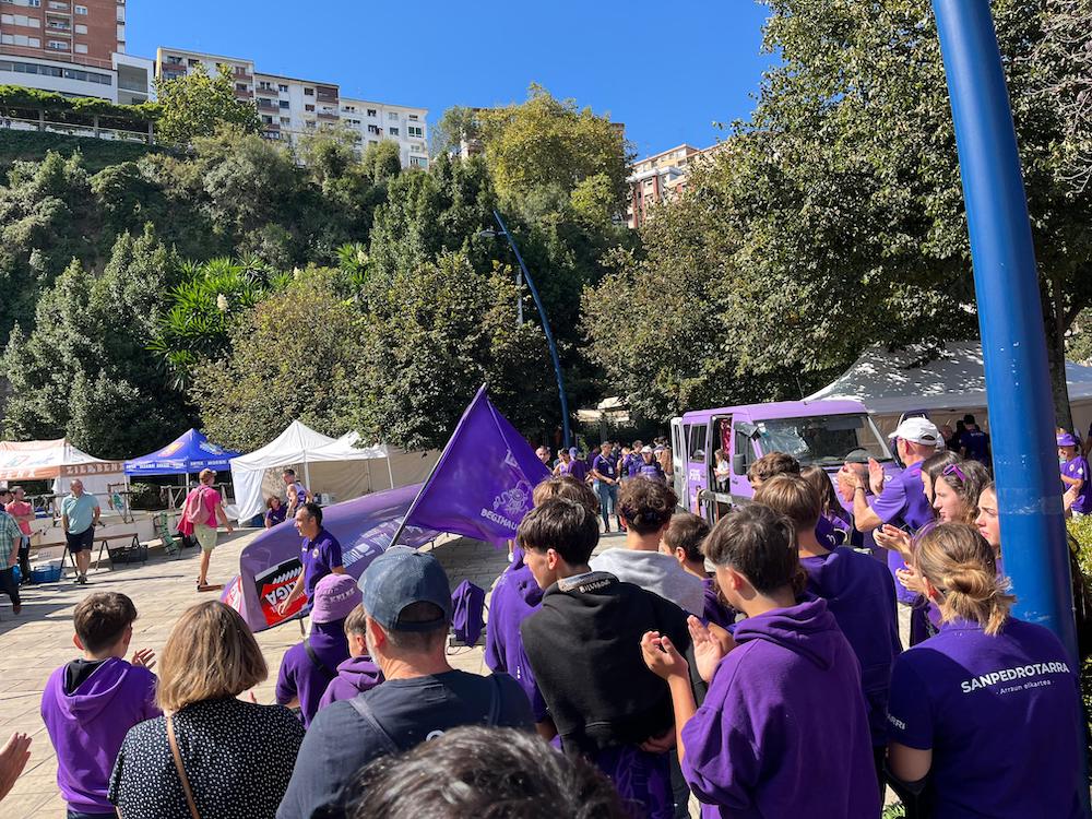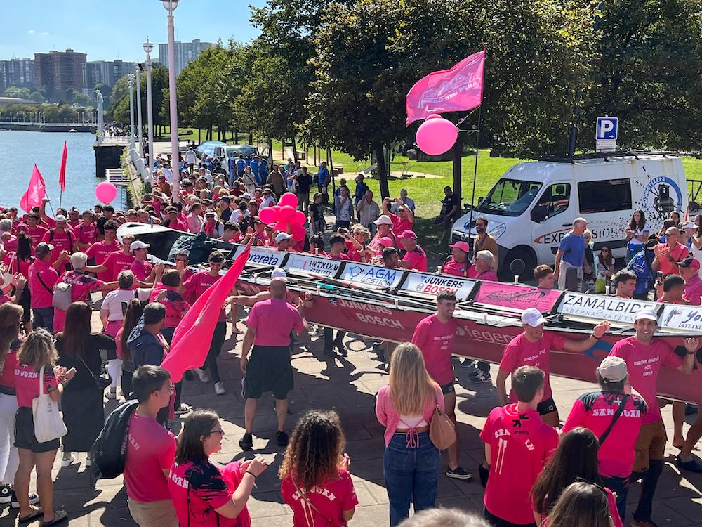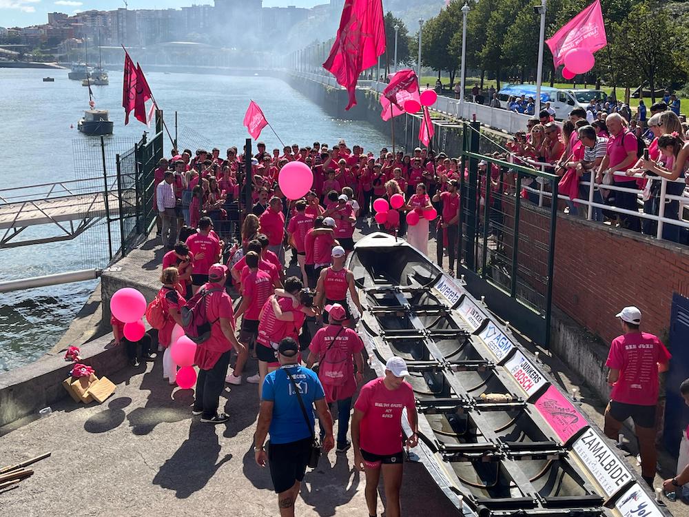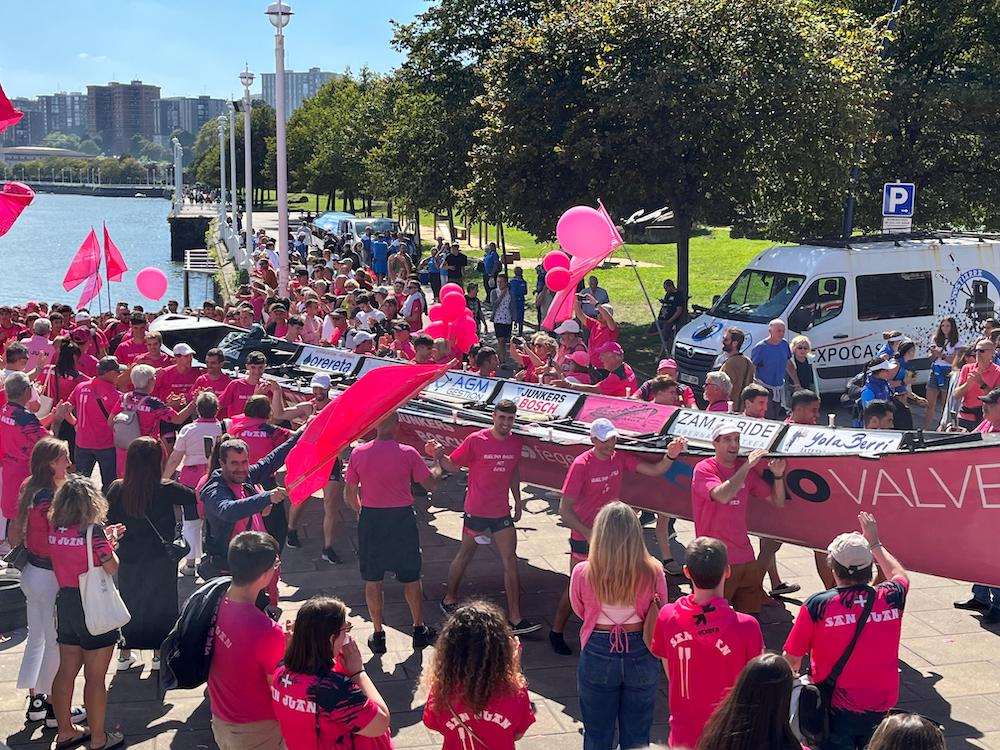 San Juaneko arraunlariak, zaleekin igoera ospatzen. Atzo Bermeon egindako lana ederki asko errematatu du gaur San Juanek. Eusko Label Ligako kanporaketaren bigarren jardunaldia irabazi, eta 2025ean gizonezkoen traineru liga onenean aritzeko eskubidea bere egin du. 2018an galdutako hura berreskuratu dute. San Pedrok, ordea, gaurkoan ere laugarren postua eskuratu, eta maila galdu du. Atzo Bermeon egindako lanak pisu handia izan du gaurkoan, arrosen alde, eta moreen kontra. Portugaleten izan diren zale arrosek sekulako betekada jaso dute, emozioa bor-bor, garaipenaren loria gorputzean.